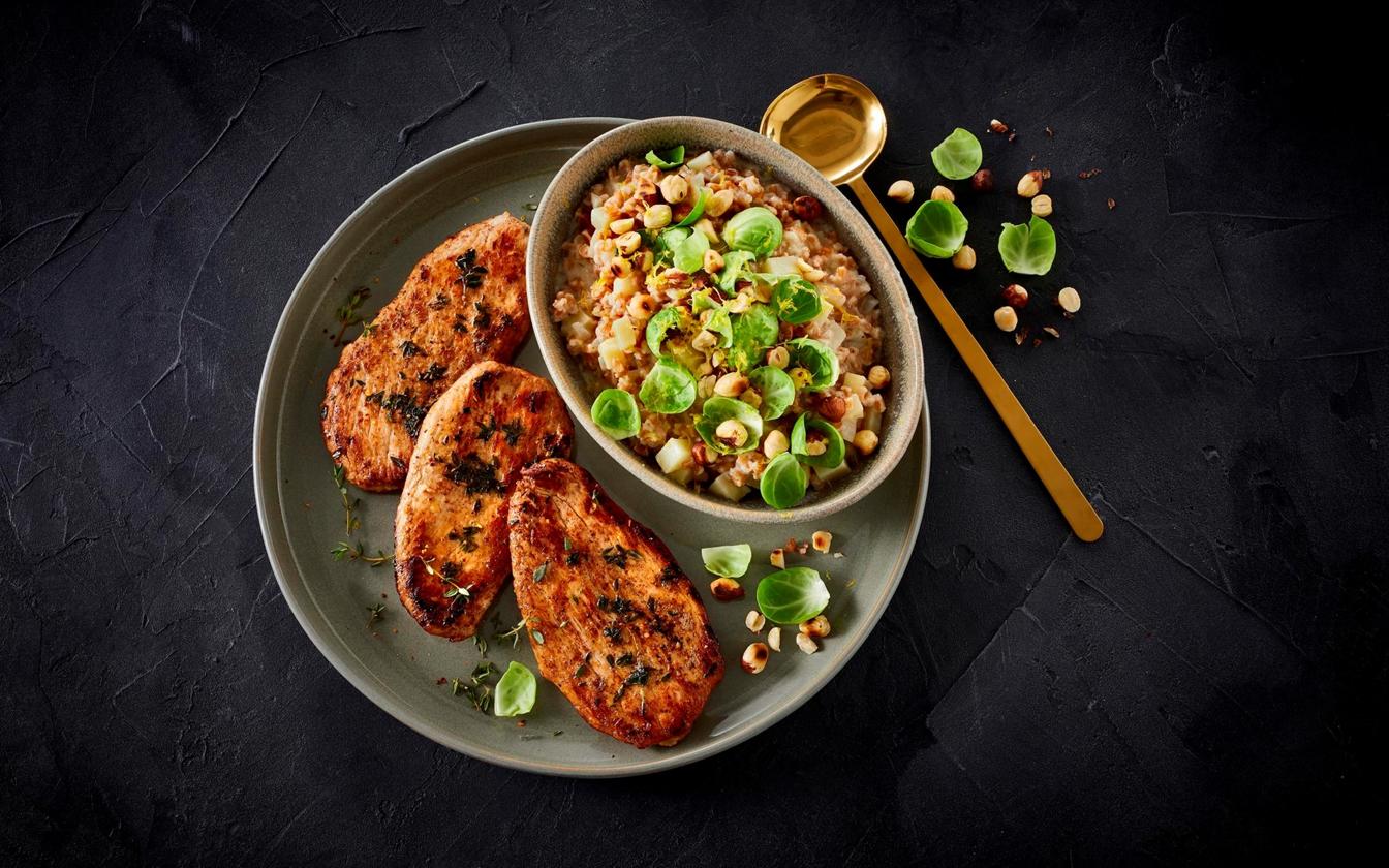 Schnitzel med speltotto, rosenkål og hasselnødder