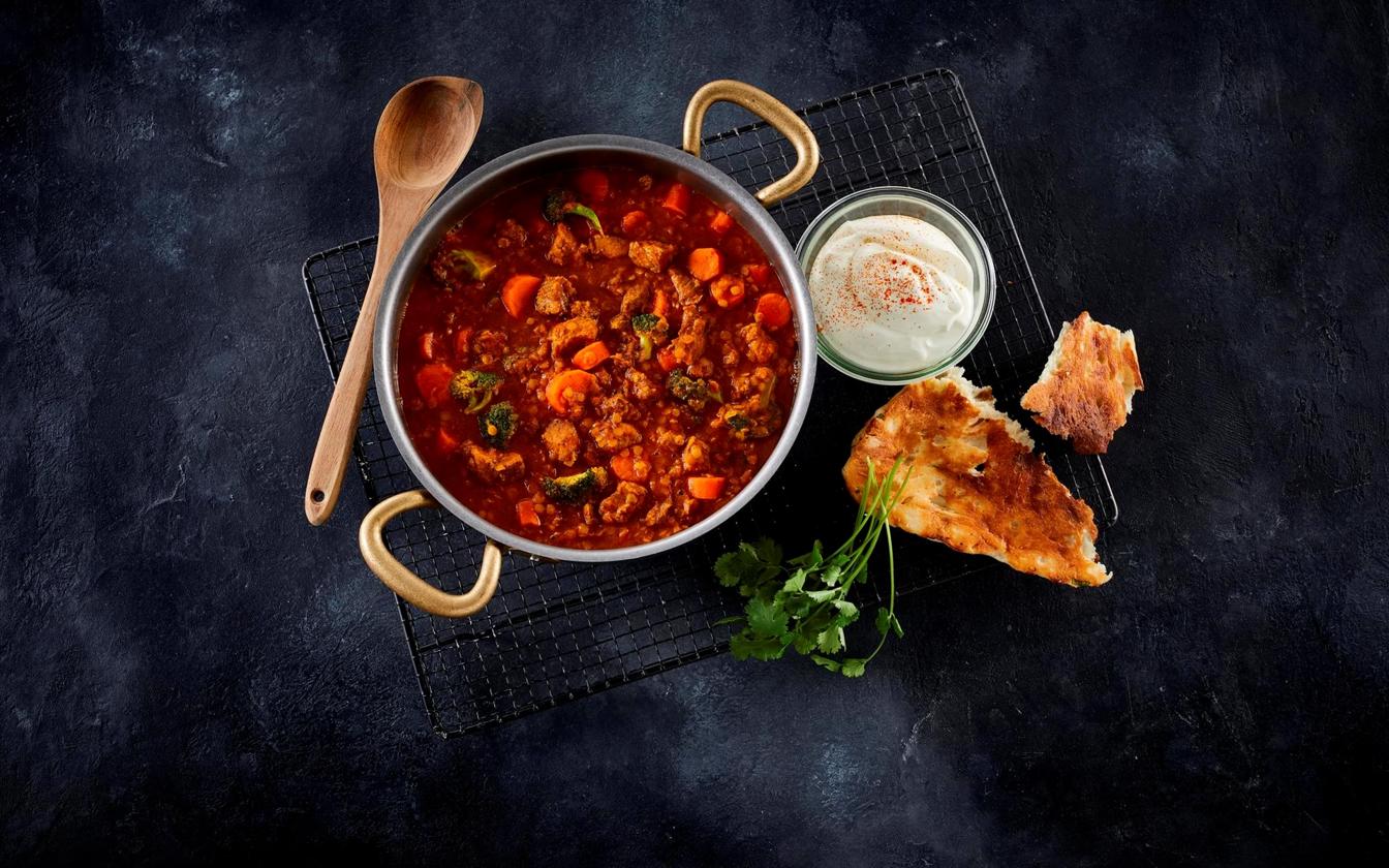Skinkekød i tern og linser i krydret tomatsauce
