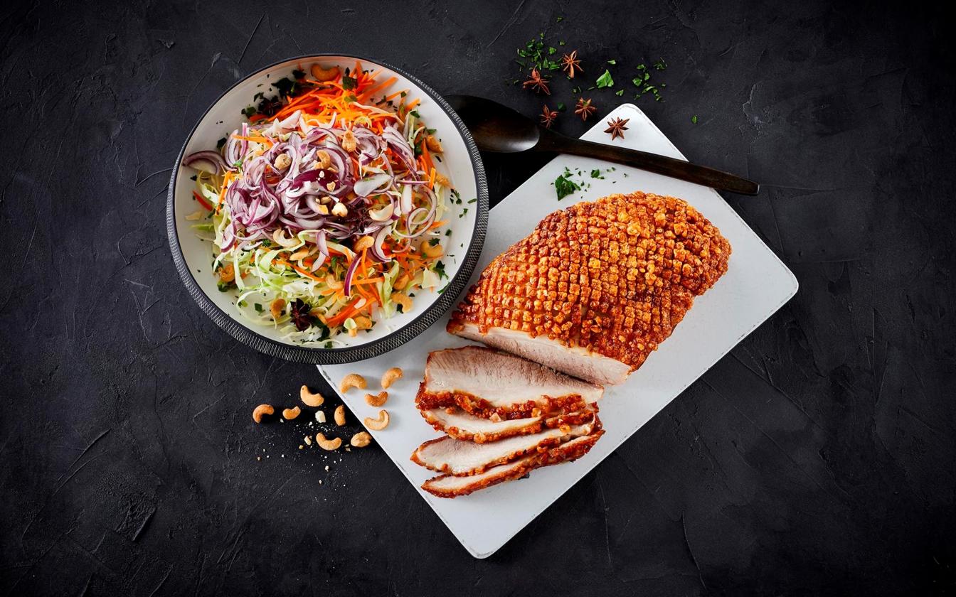 Skinkesteg med svær, kål, cashew og stjerneanis