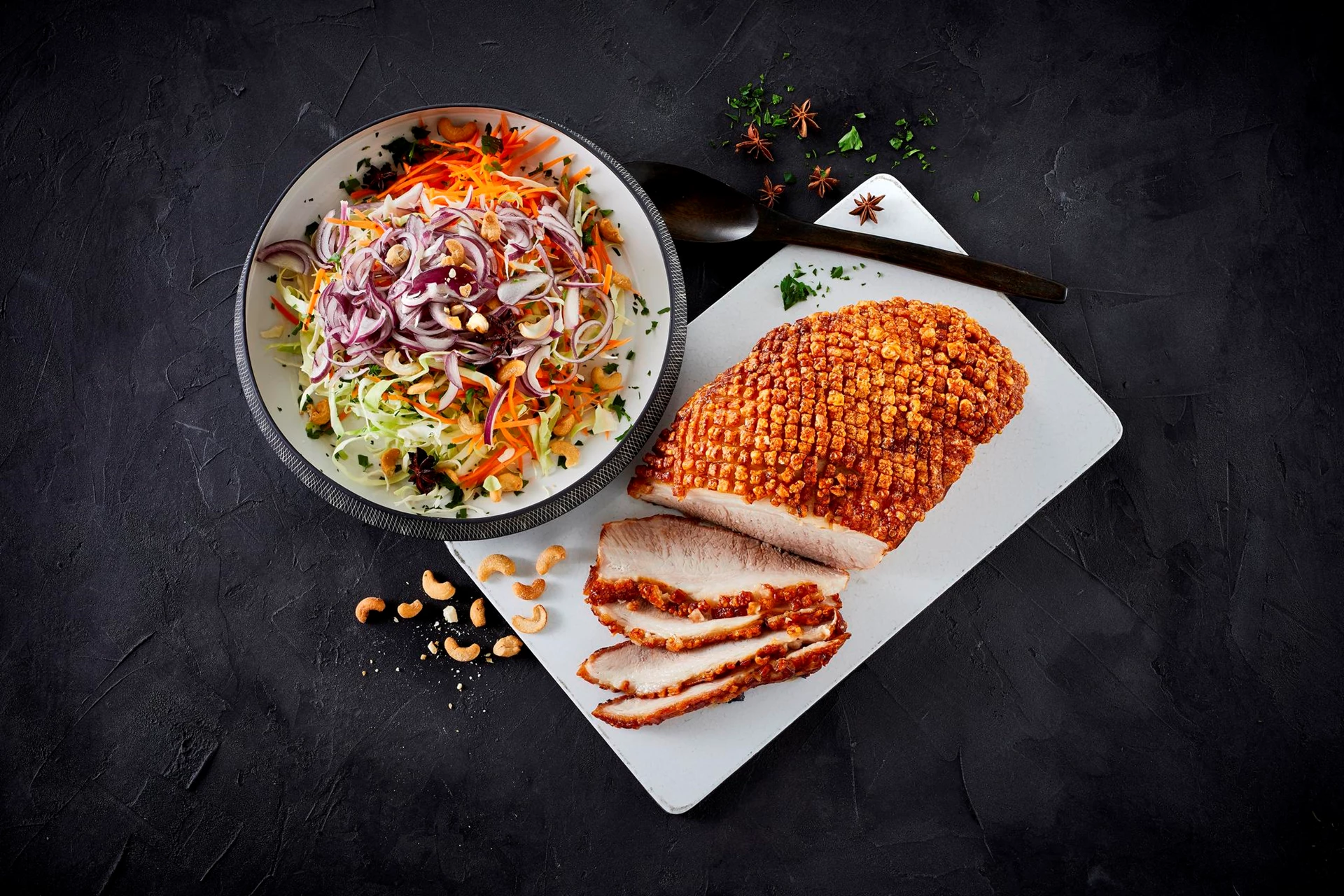 Skinkesteg med svær, kål, cashew og stjerneanis