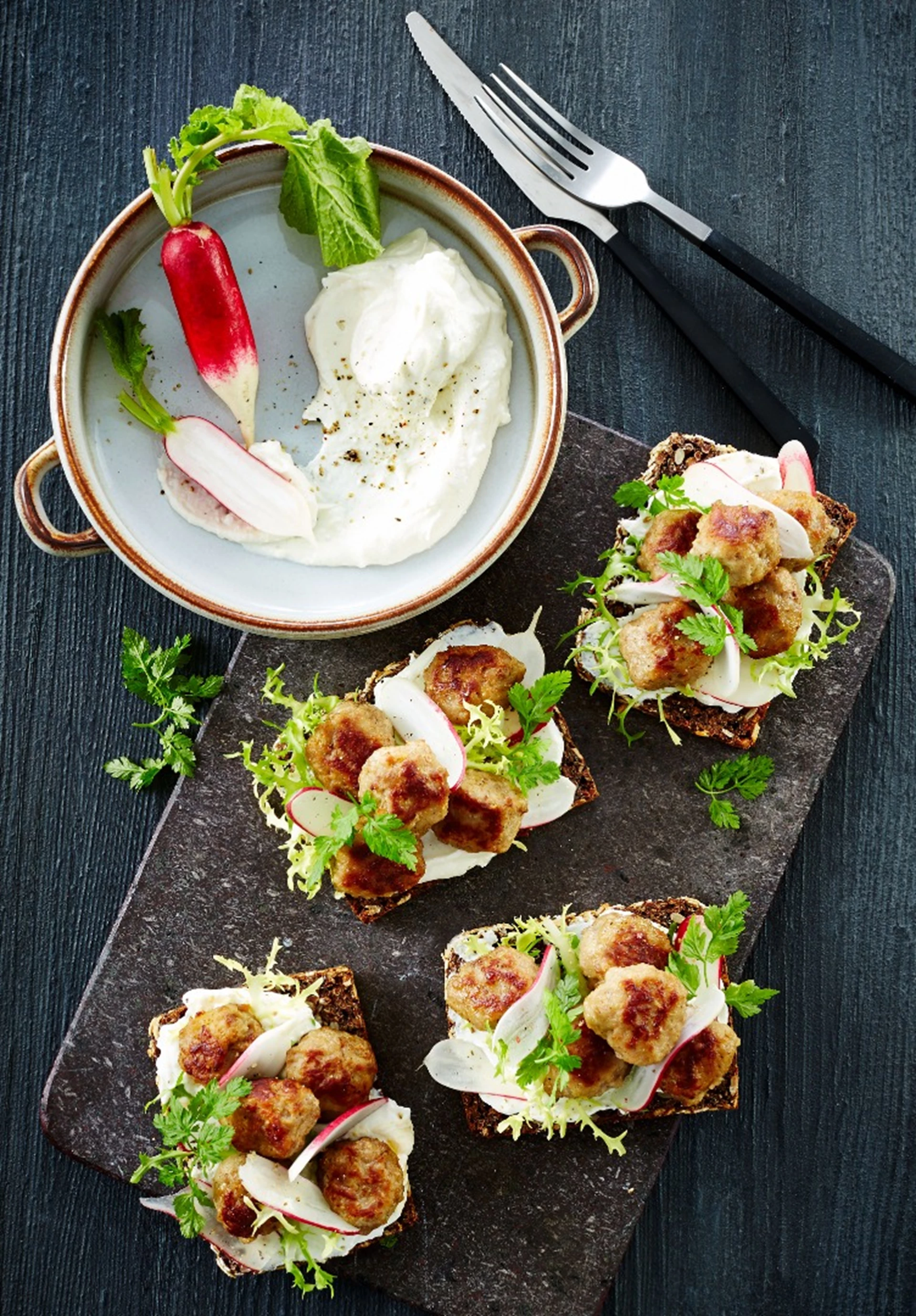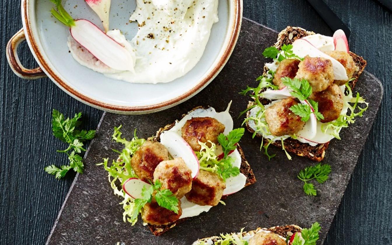 Smørrebrød med frikadelle, rygeostcreme og urter