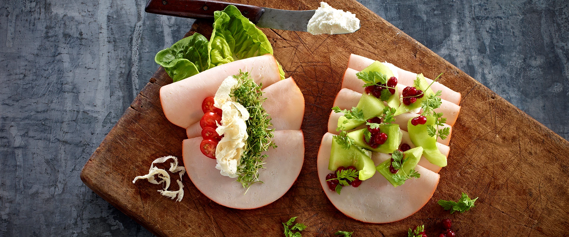 Kalkunbryst med ramsløgsmarinerede agurker, tyttebær og rygeost