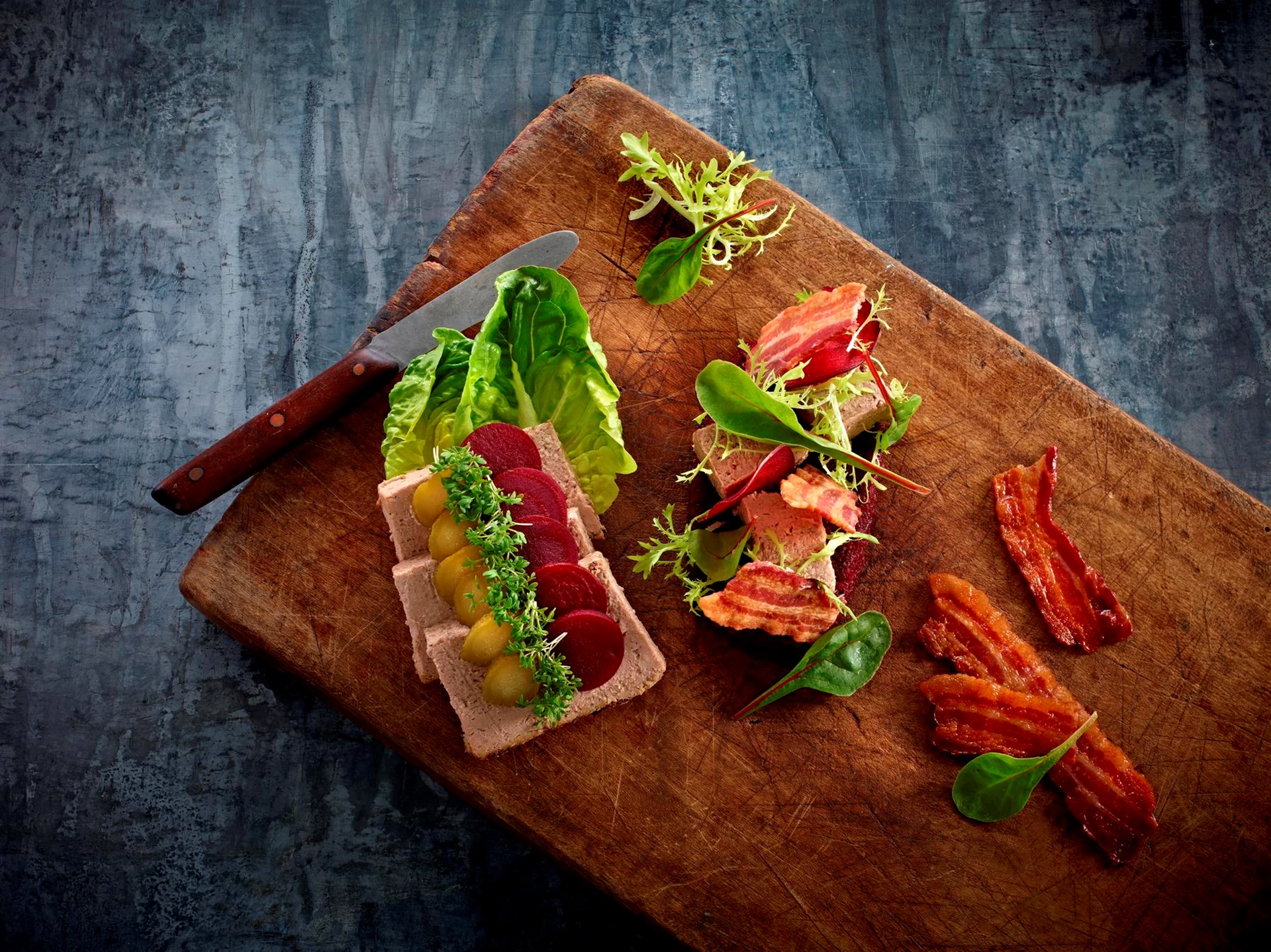 Smørrebrød med leverpostej, bacon, figner og karse