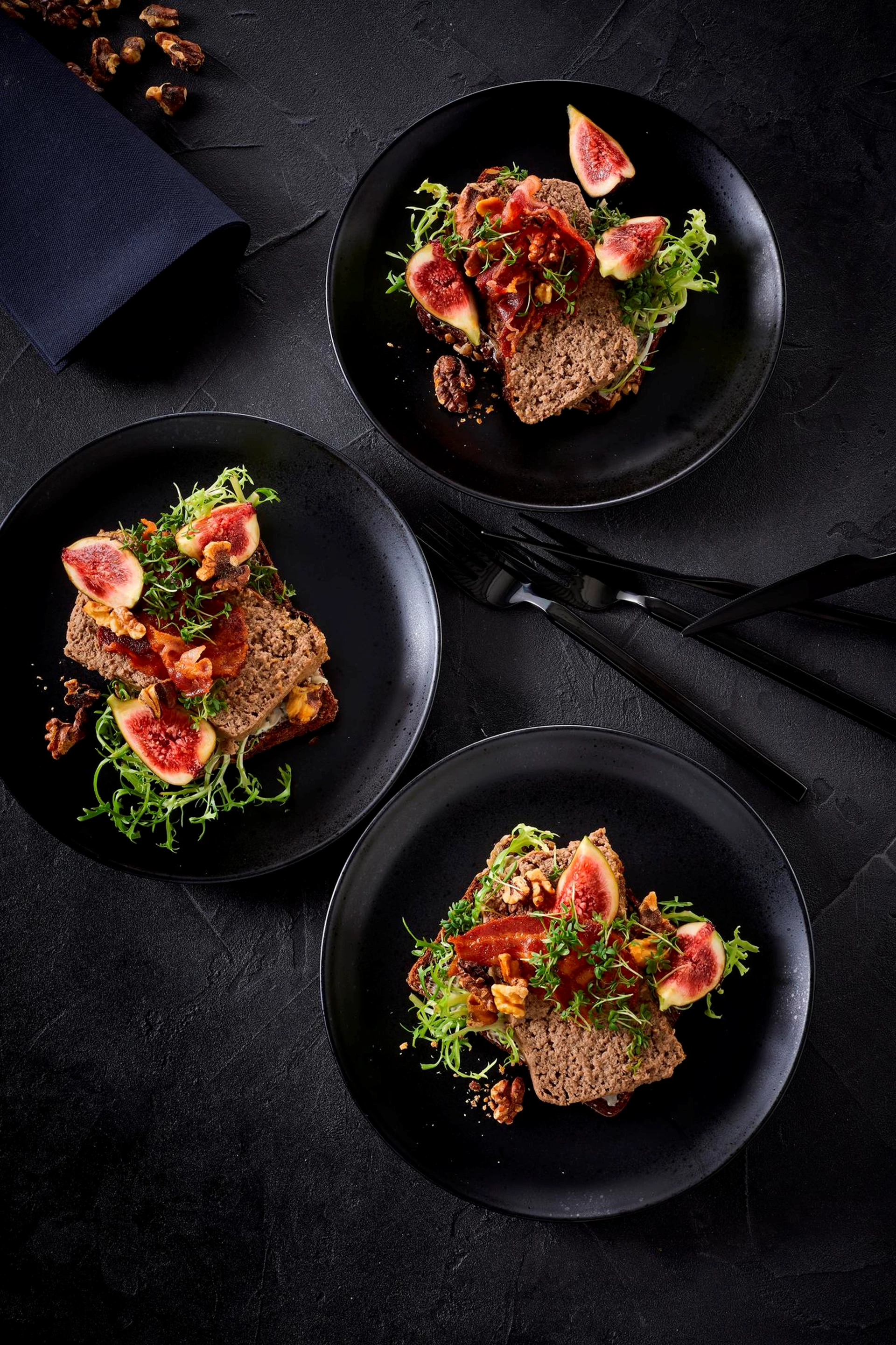 Kom smør og salat på rugbrød. Læg en skive leverpostej på og top med bacon, friske figner, ristede valnødder og karse.