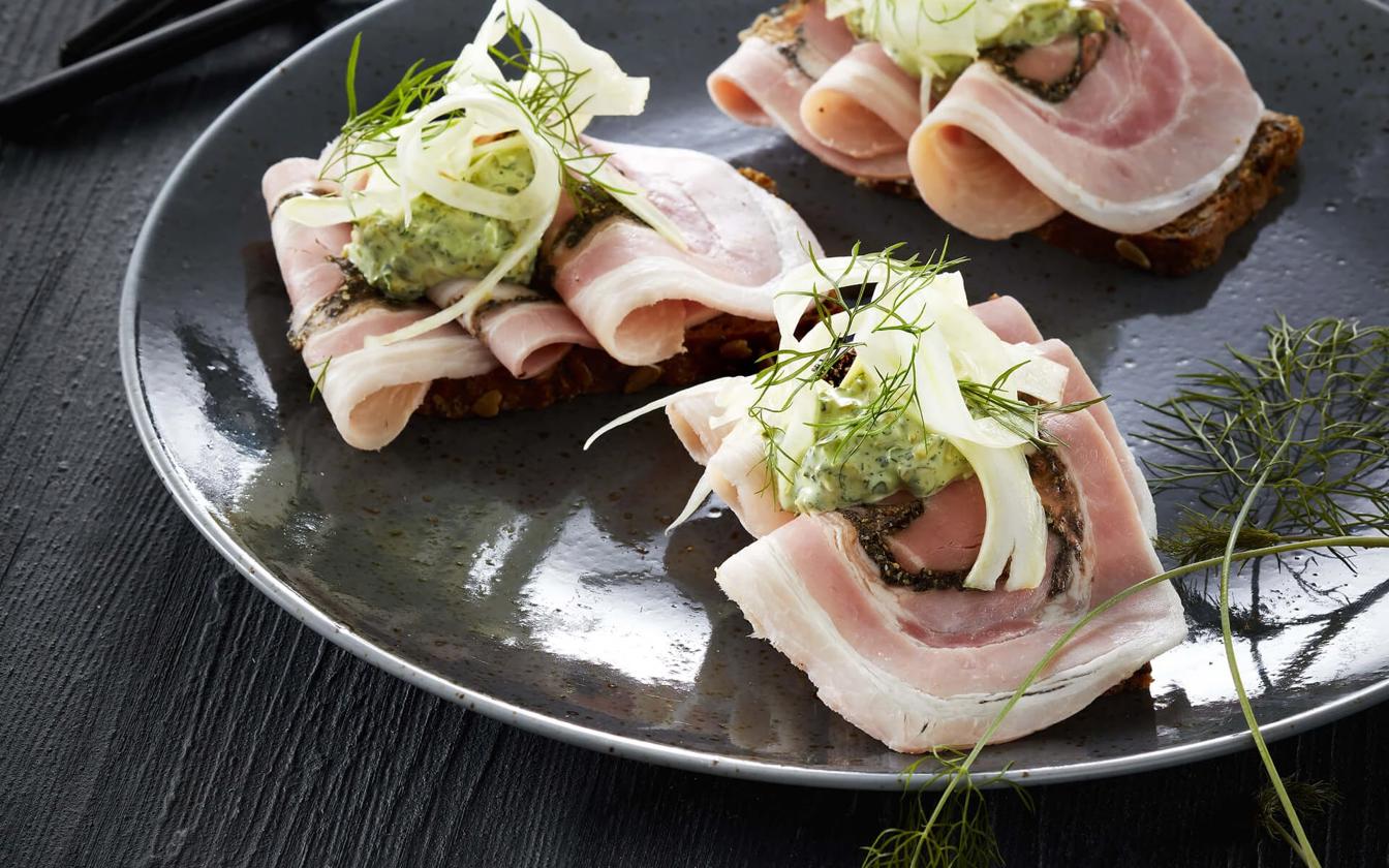 Smørrebrød med rullepølse, fennikel og tatar