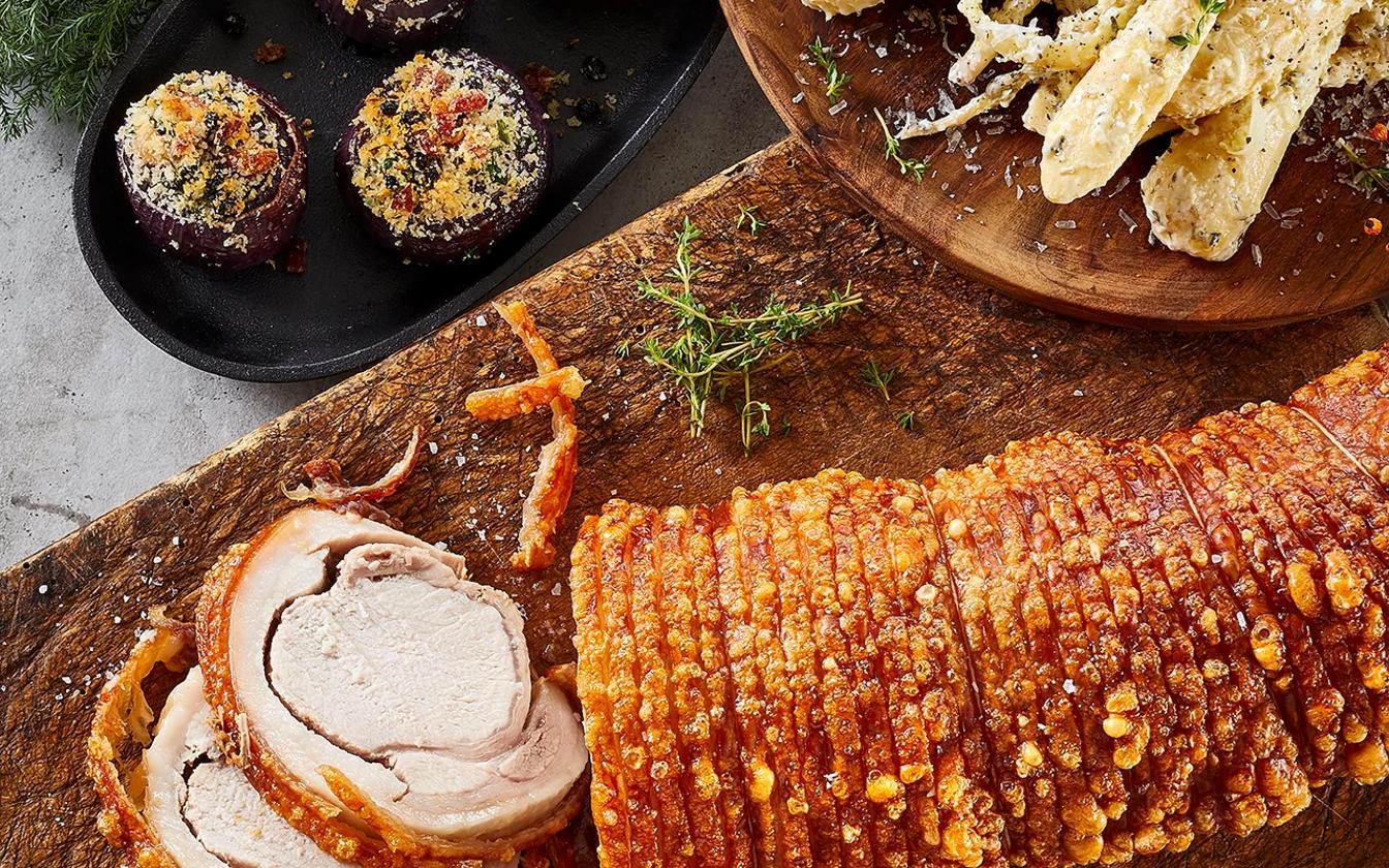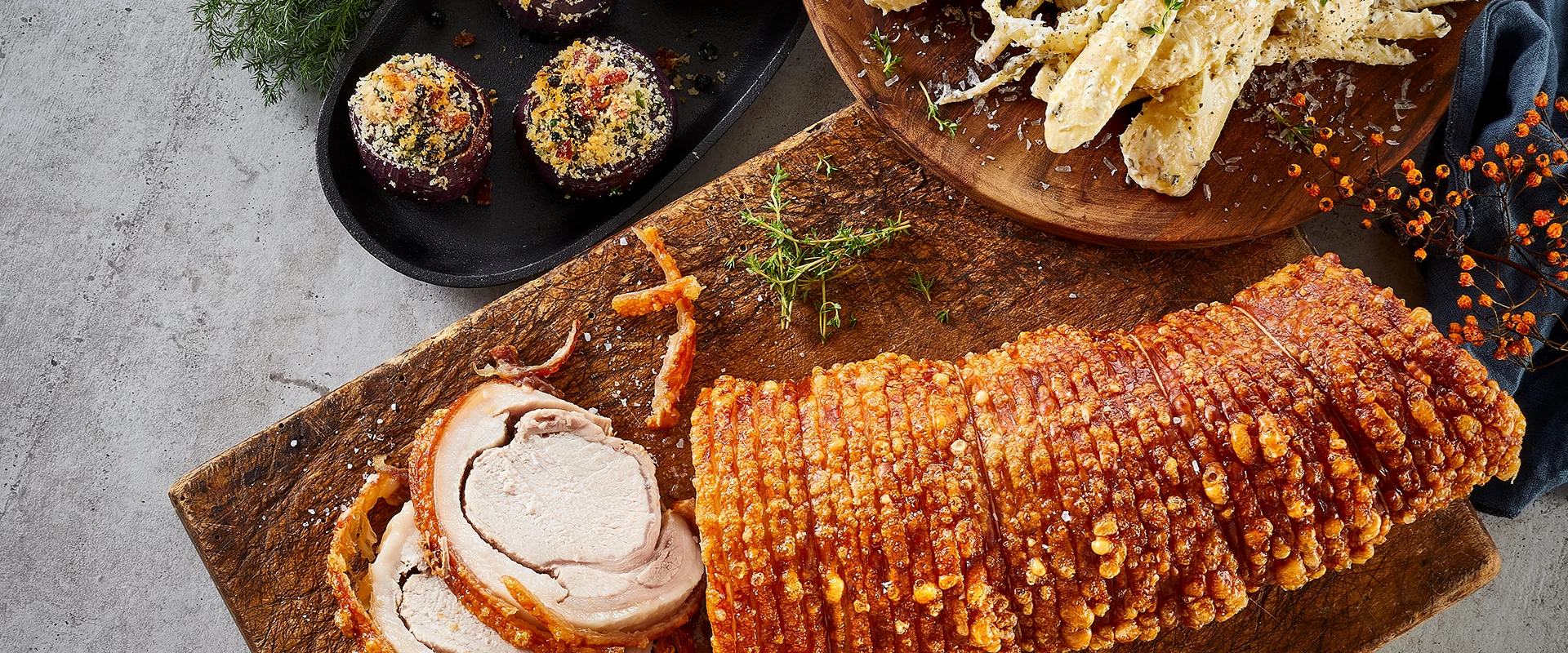Denne opskrift løfter flæskestegen til et nyt niveau – sprøde svær, saftigt kød og et smagfuldt twist med laurbær. Tilbehøret gør retten til noget helt særligt: søde, cremede pastinakker med ost og timian samt bagte rødløg fyldt med æble, panchetta og krydderurter. En oplagt servering til højtider eller særlige anledninger, hvor klassisk dansk flæskesteg gerne må få et moderne og smagsintensivt modspil. Perfekt til både julebordet og gæstemiddagen.
