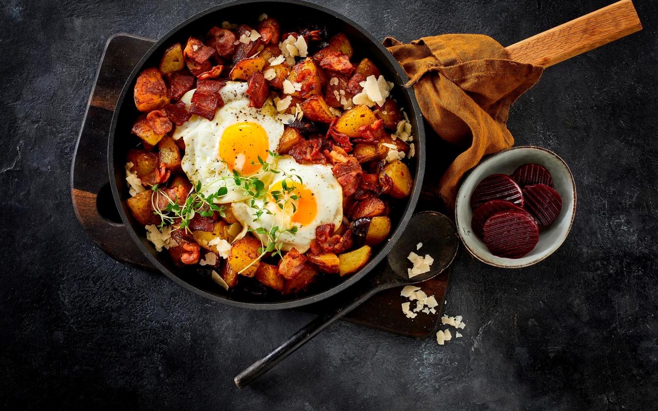 Stegte kartofler med bacon, spejlæg og parmesan