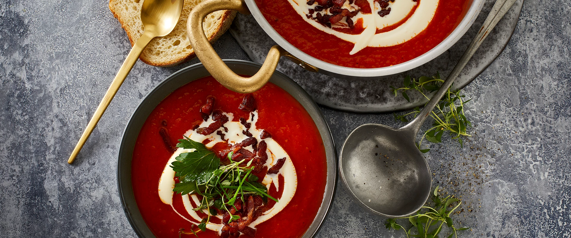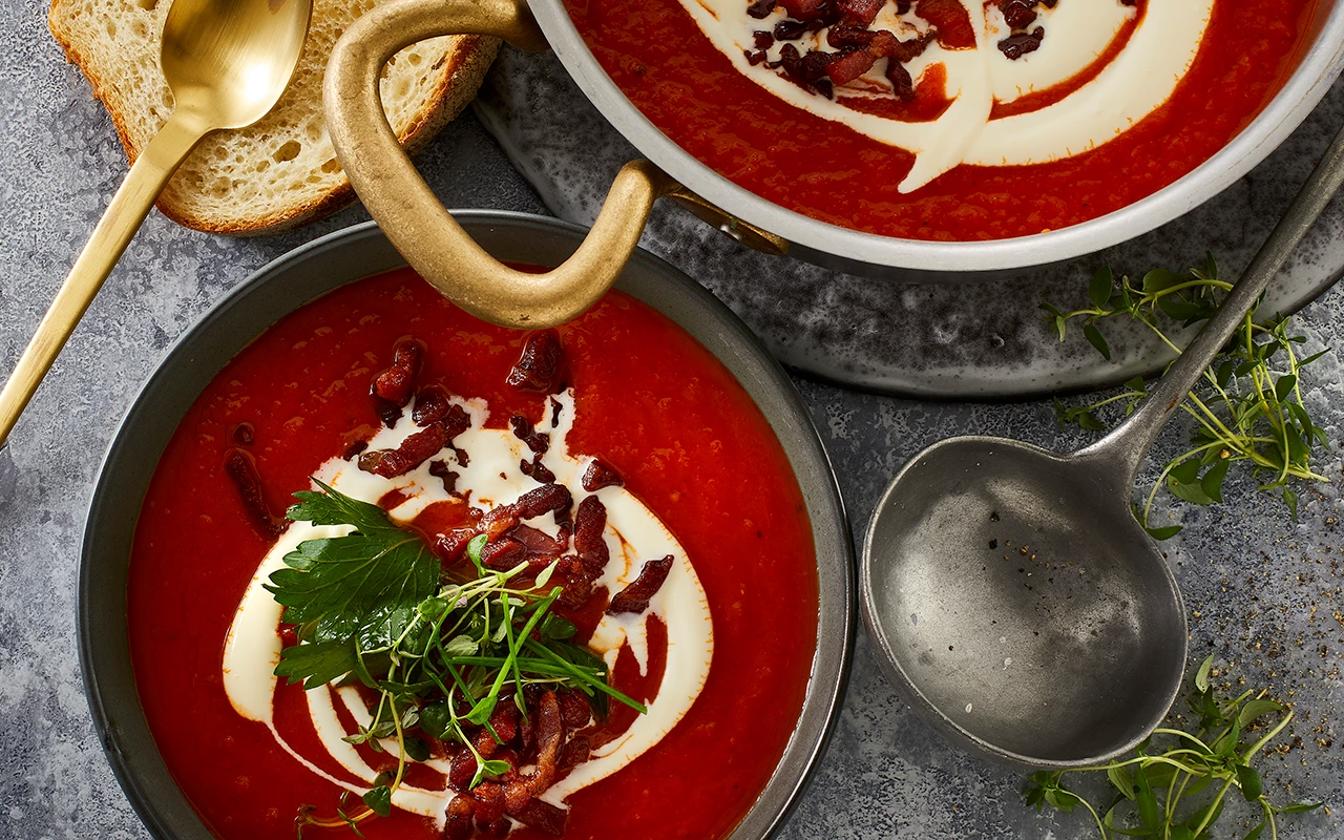 Tomatsuppe med sprød bacon, fløde og friske urter