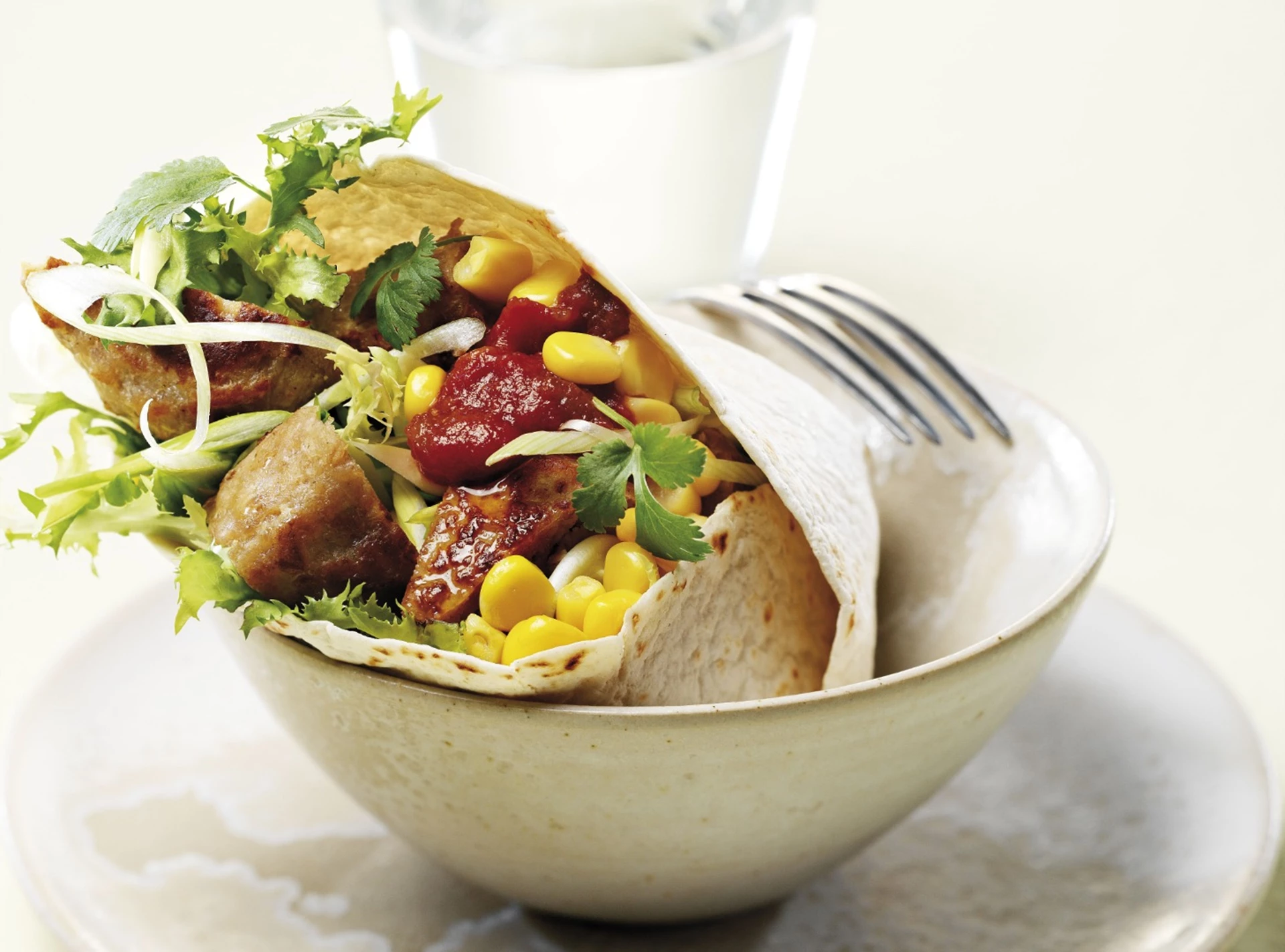 Tortilla med frikadeller, grønt og salsa