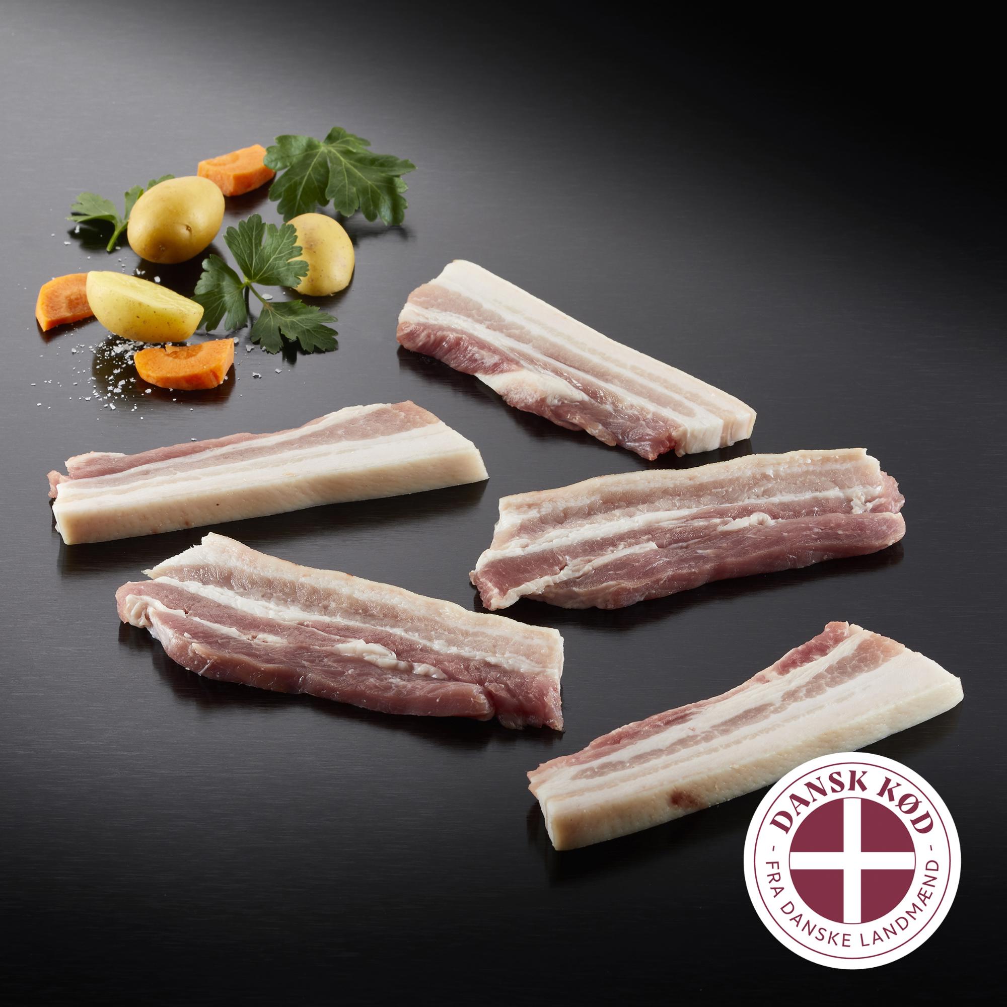 Flæsk i skiver, m/svær, u/ben, ca. 8 mm