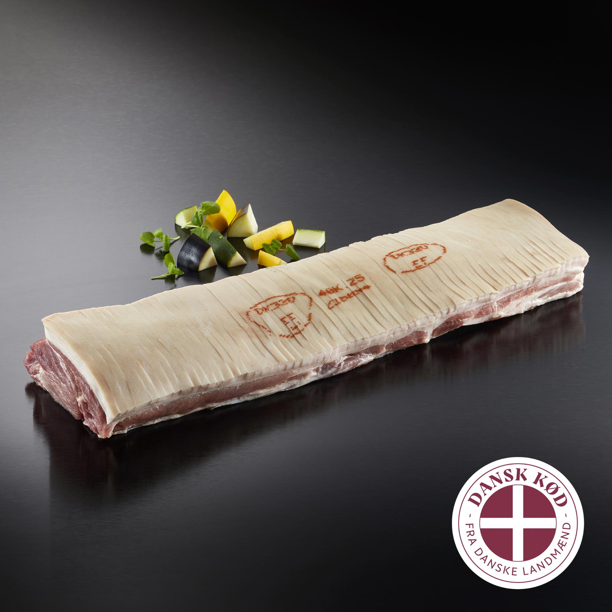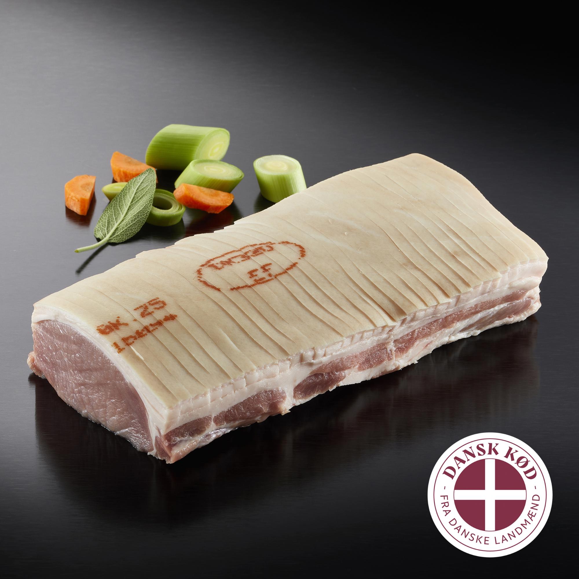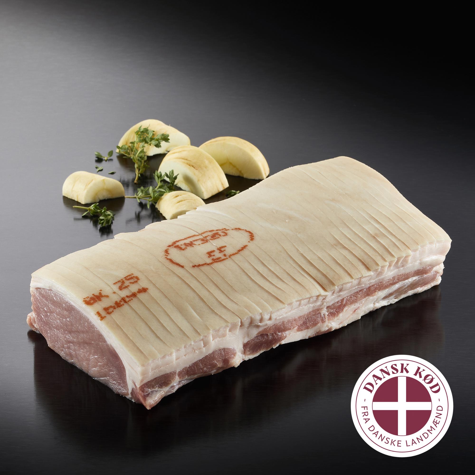 Flæskesteg u/ben, u/hofte, tilsat lage, ridset, ½ kam