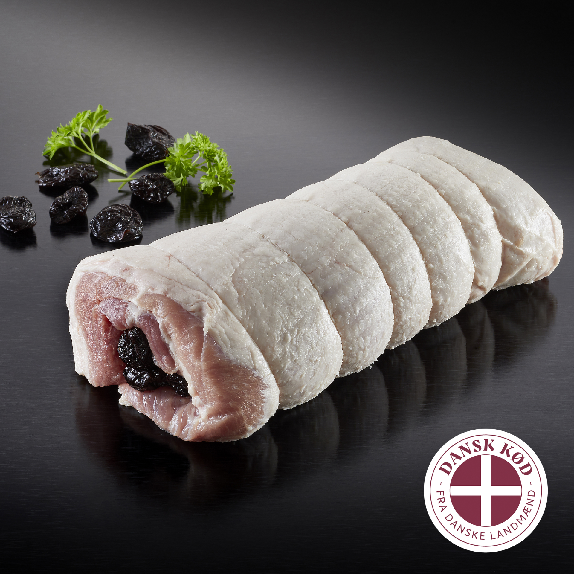 Ingredienser: Bryst af gris u/ben u/svær, rullet med ca. 6% svesker.