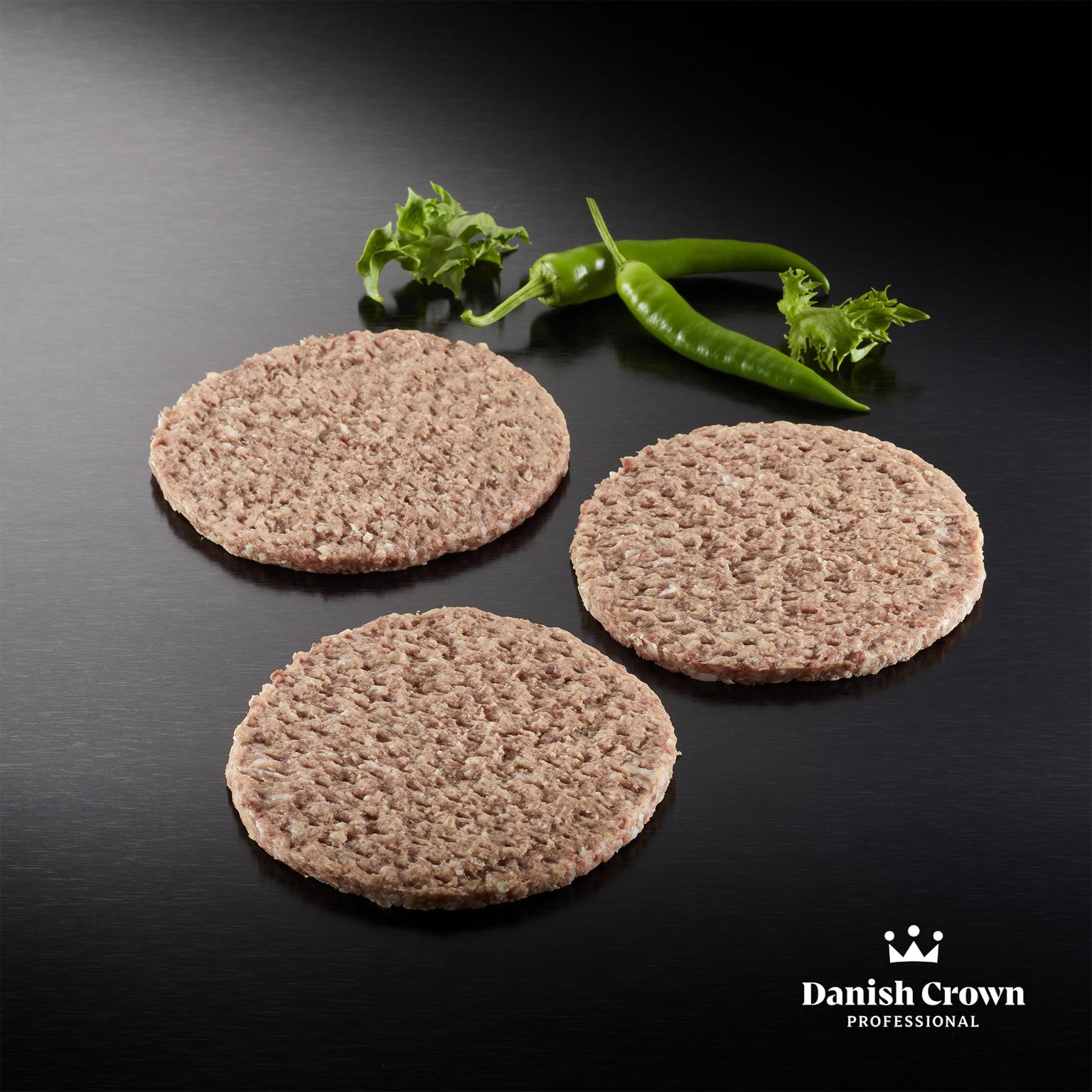 Tilpas krydret oksebøf med højt kødindhold (99%). Diameter 120-135 mm.