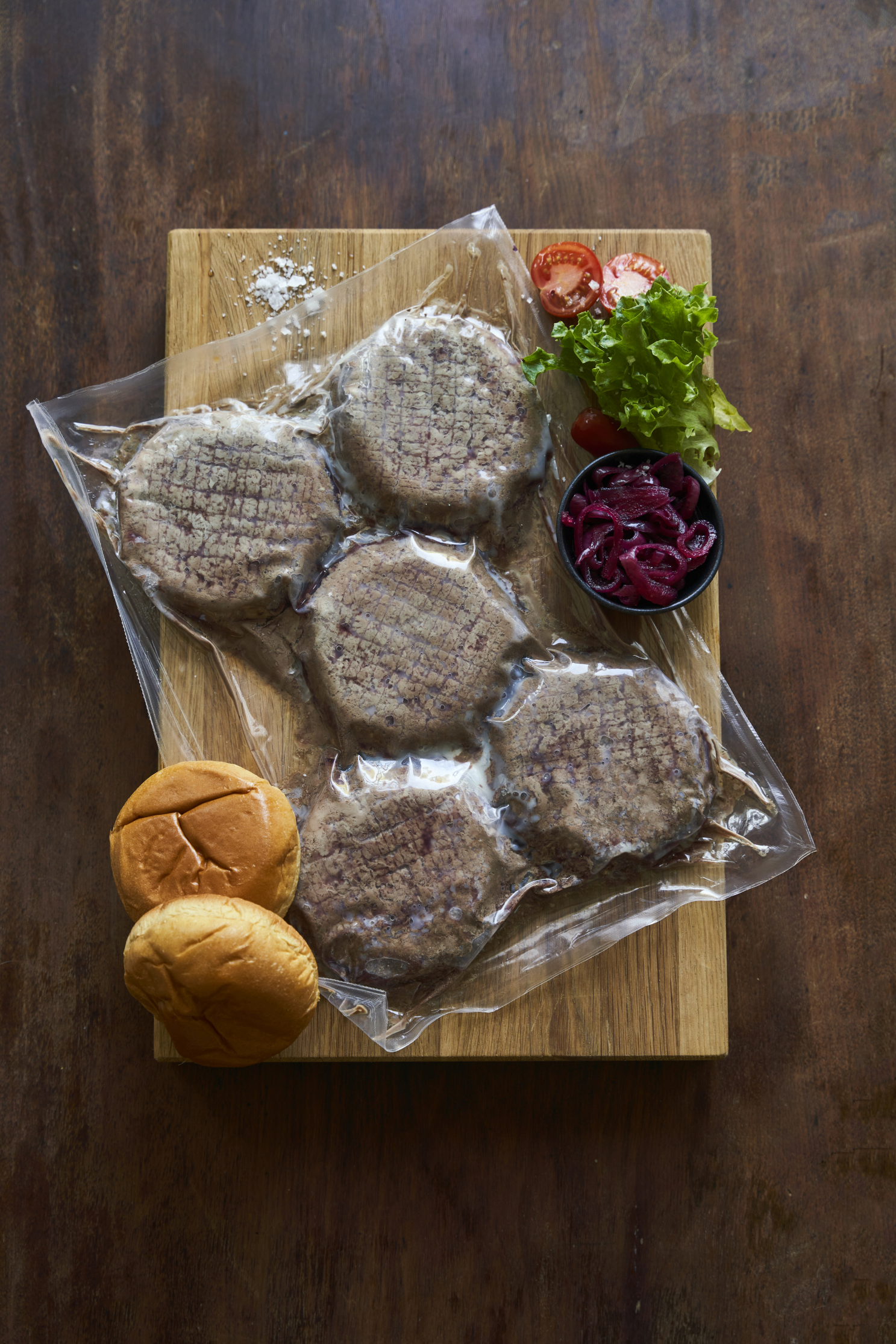 Kan serveres i en burger med bagte tomater, syltede rødløg, sprødstegt panchetta og basilikumscreme.