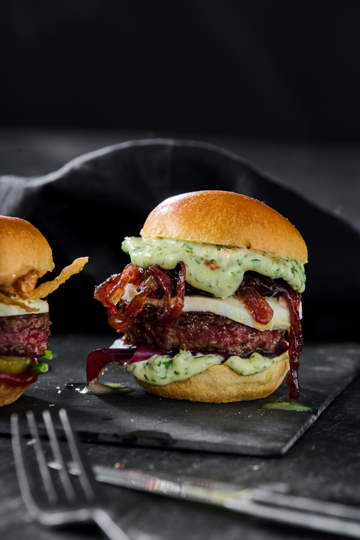 Kan serveres i en burger med bagte tomater, syltede rødløg, sprødstegt panchetta og basilikumscreme.