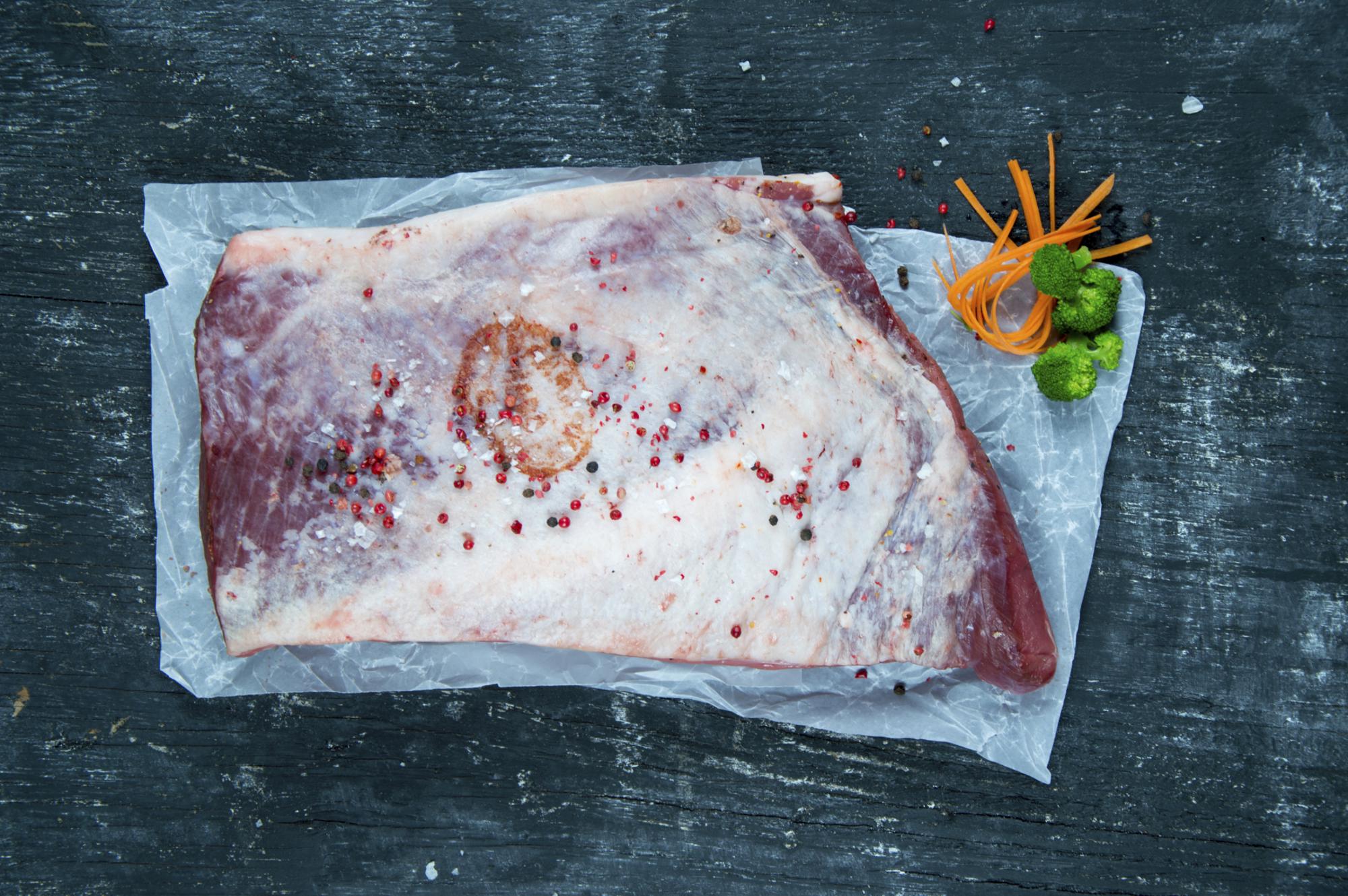 Kan serveres i en burger med bagte tomater, syltede rødløg, sprødstegt panchetta og basilikumscreme.