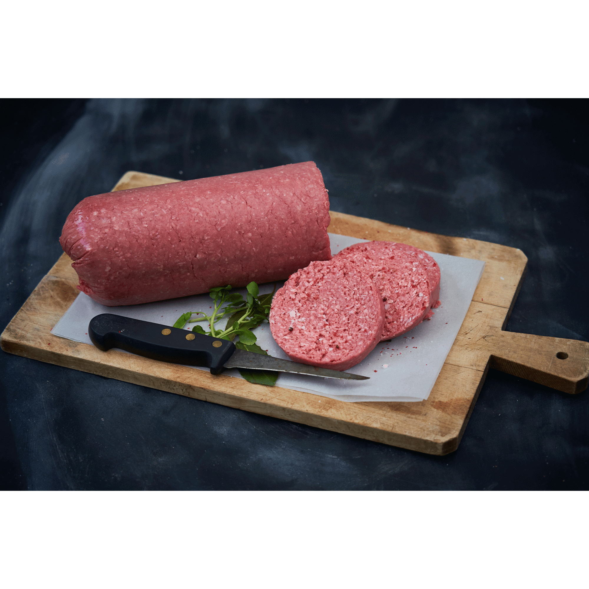 Hakket oksekød 50 %, rehydreret ærteprotein 25 %, rodfrugter 20 % (pastinak, gulerødder), fermenteret løg 5 %.