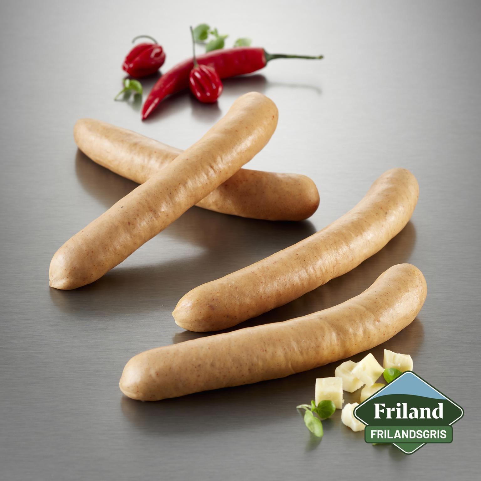 Ingredienser: Grisekød (70%), vand, økologisk CHEDDAROST (8%) (økologisk MÆLK, salt, starter kultur, osteløbe, farve (E160b(ii))), kartoffelstivelse, SOJAPROTEIN, salt, chili, krydderier, stabilisator (E 451), druesukker, surhedsregulerende middel (E 300, E 331), glukosesirup, krydderiekstrakt, konserveringsmiddel (E 250), grisetarm.