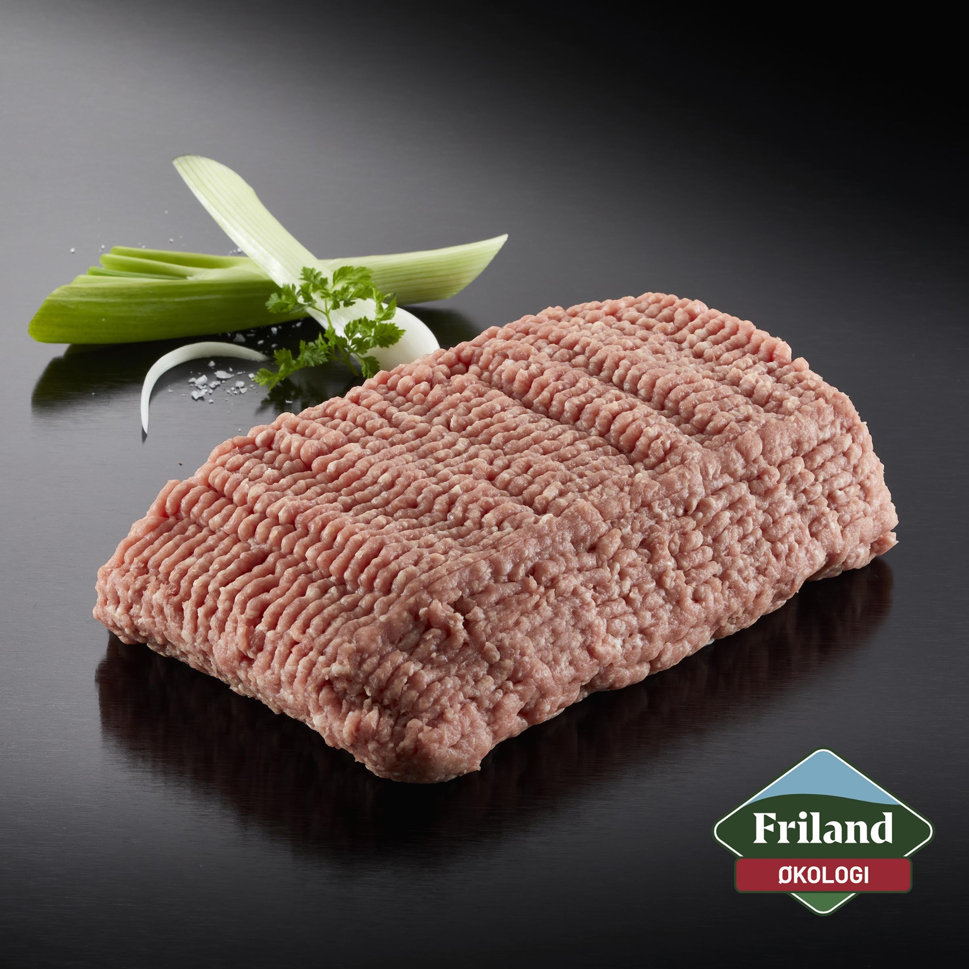 Hakket kød af dansk, økologisk gris. Grisene fra FRILAND ØKOLOGI er født i hytter på danske marker, har altid adgang til det fri, bliver fodret med 100% økologisk foder og så har de krølle på halen. Kødet fra FRILAND ØKOLOGI er anbefalet af Dyrenes Beskyttelse.