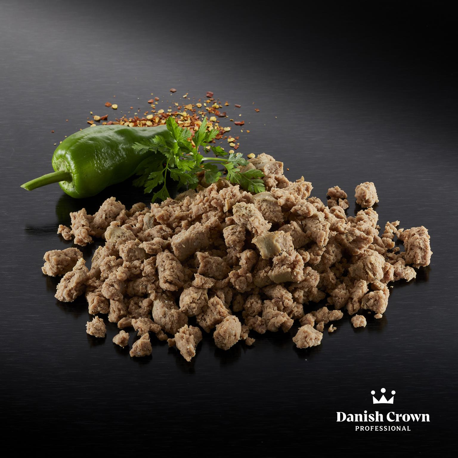 Stykker af 85% krydret, hakket oksekød. Kan anvendes som topping på f.eks. pizza.