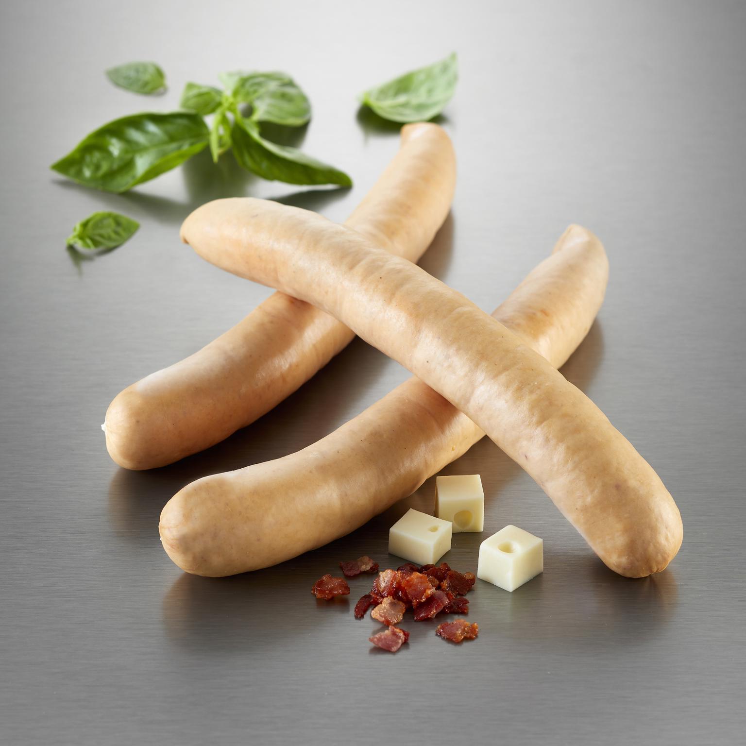 Ingredienser: Grisekød (55%), bacon (11%) (grisekød, salt, antioxidant (E 301), konserveringsmiddel (E 250)), vand, CHEDDAROST (8%) (MÆLK, salt, starter kultur, osteløbe, farvestof (E160a)), spæk, kartoffelstivelse, SOJAPROTEIN, salt, krydderi- og krydderurteekstrakter, svær, stabilisator (E 451), antioxidant (E 301), konserveringsmiddel (E 250), grisetarm.