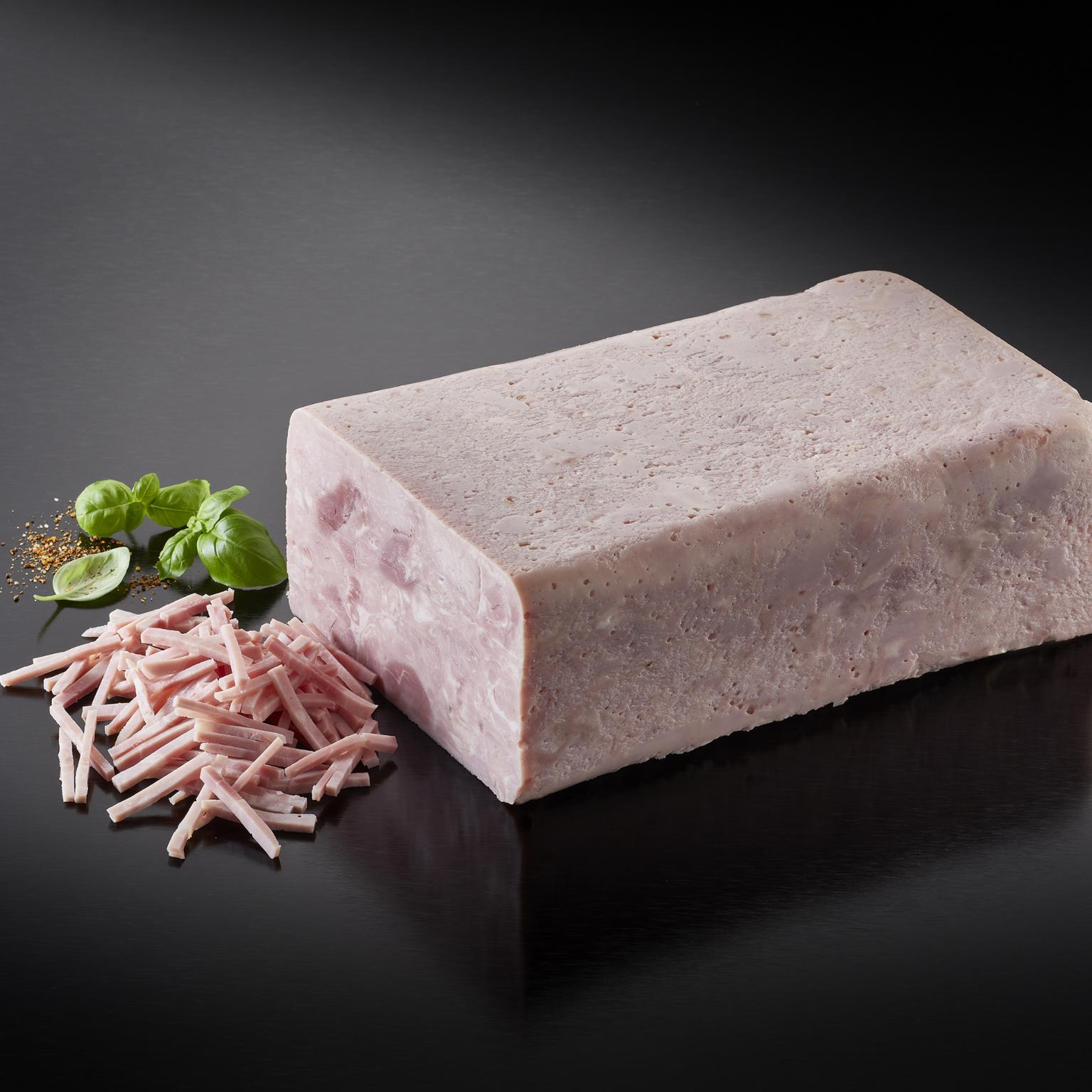 86% skinke sammensat af stykker af kød. Nem at håndtere og skære i skiver, tern eller strimler. Oplagt som topping.