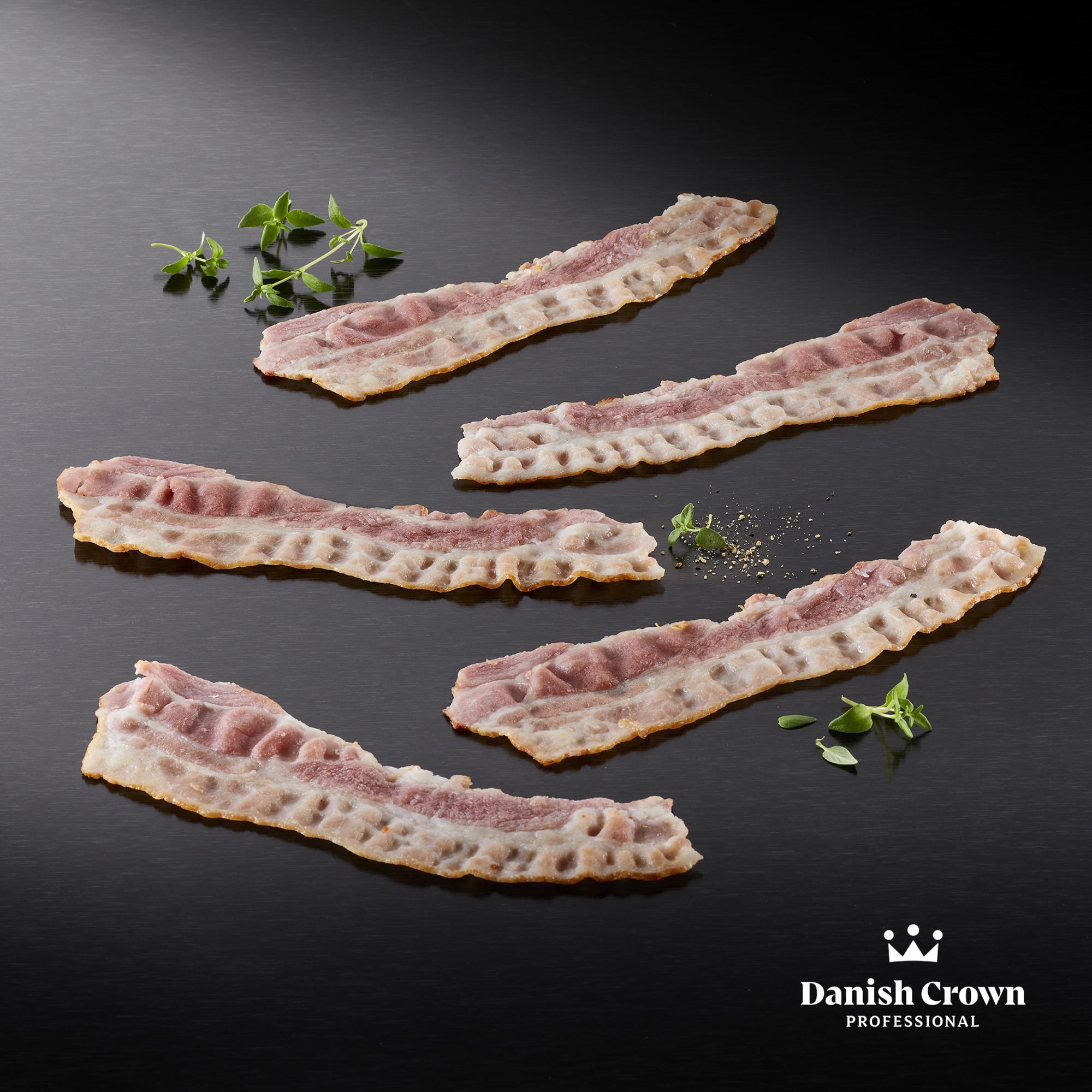 Bacon skåret i tynde skiver af et helt stykke brystflæsk. Saltet, tørret og røget over bøgeflis.