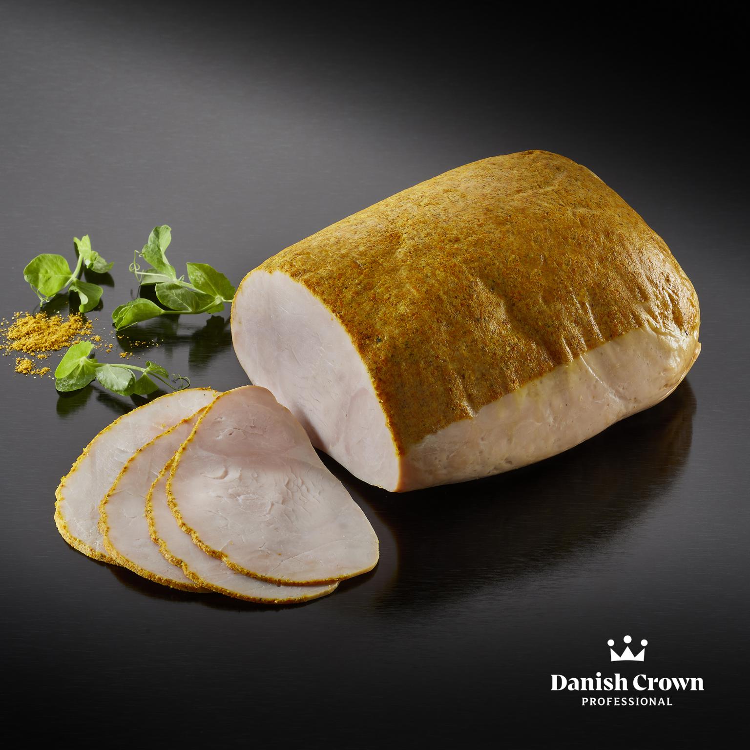 Nøglehulsmærket kalkunbryst af sammensatte stykker af kød. Kogt og røget over bøgeflis og krydret med karry. Nem at håndtere på pålægsmaskinen.