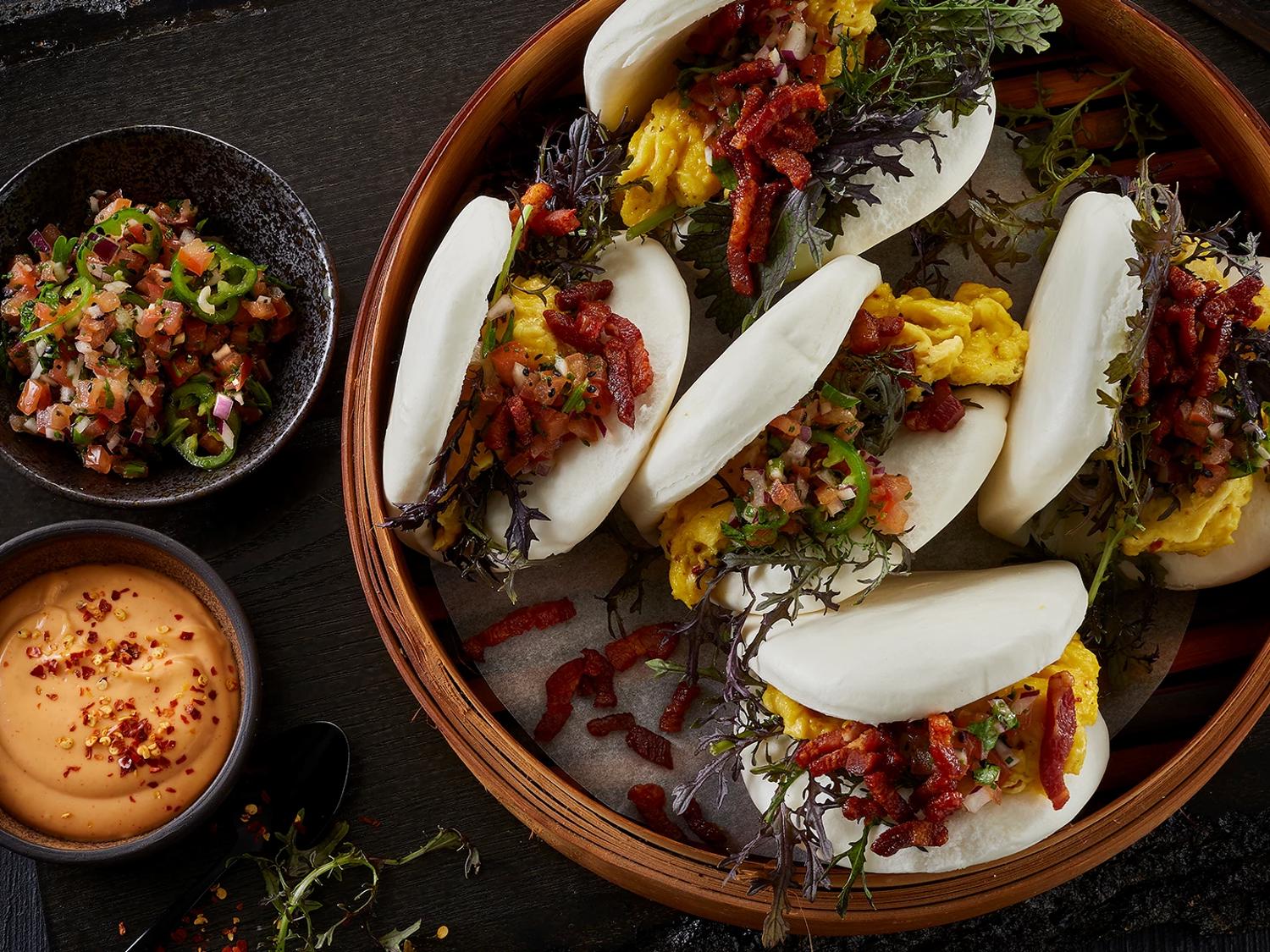 Bao med bacon, scrambled eggs og tomatsalsa