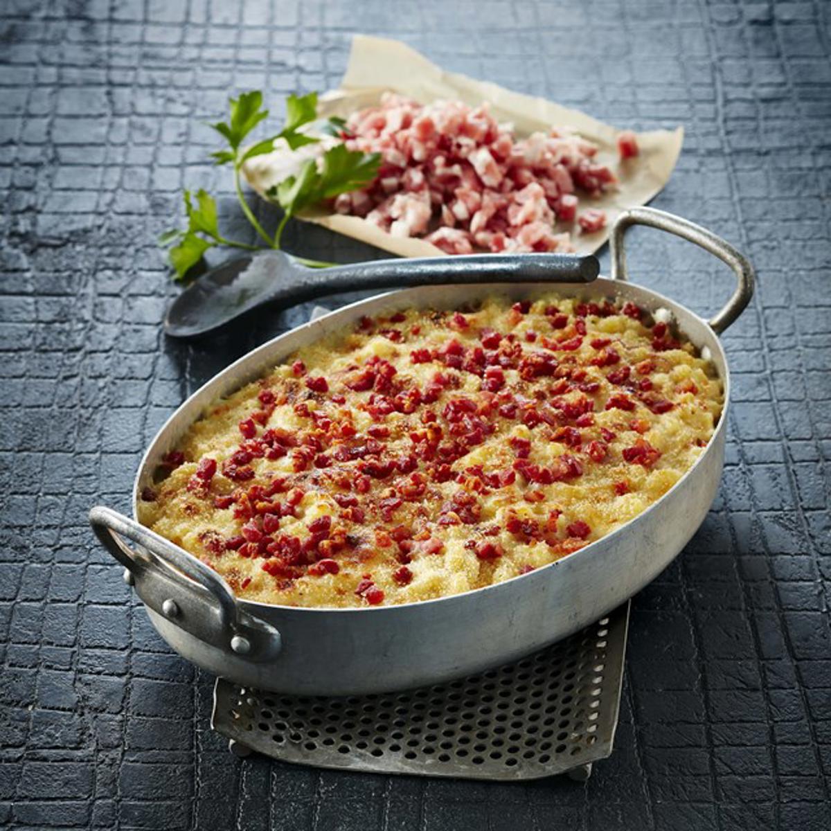 Zart: Bacon-Scheiben in eine kalte, trockene Pfanne legen und bei schwacher Wärme braten.