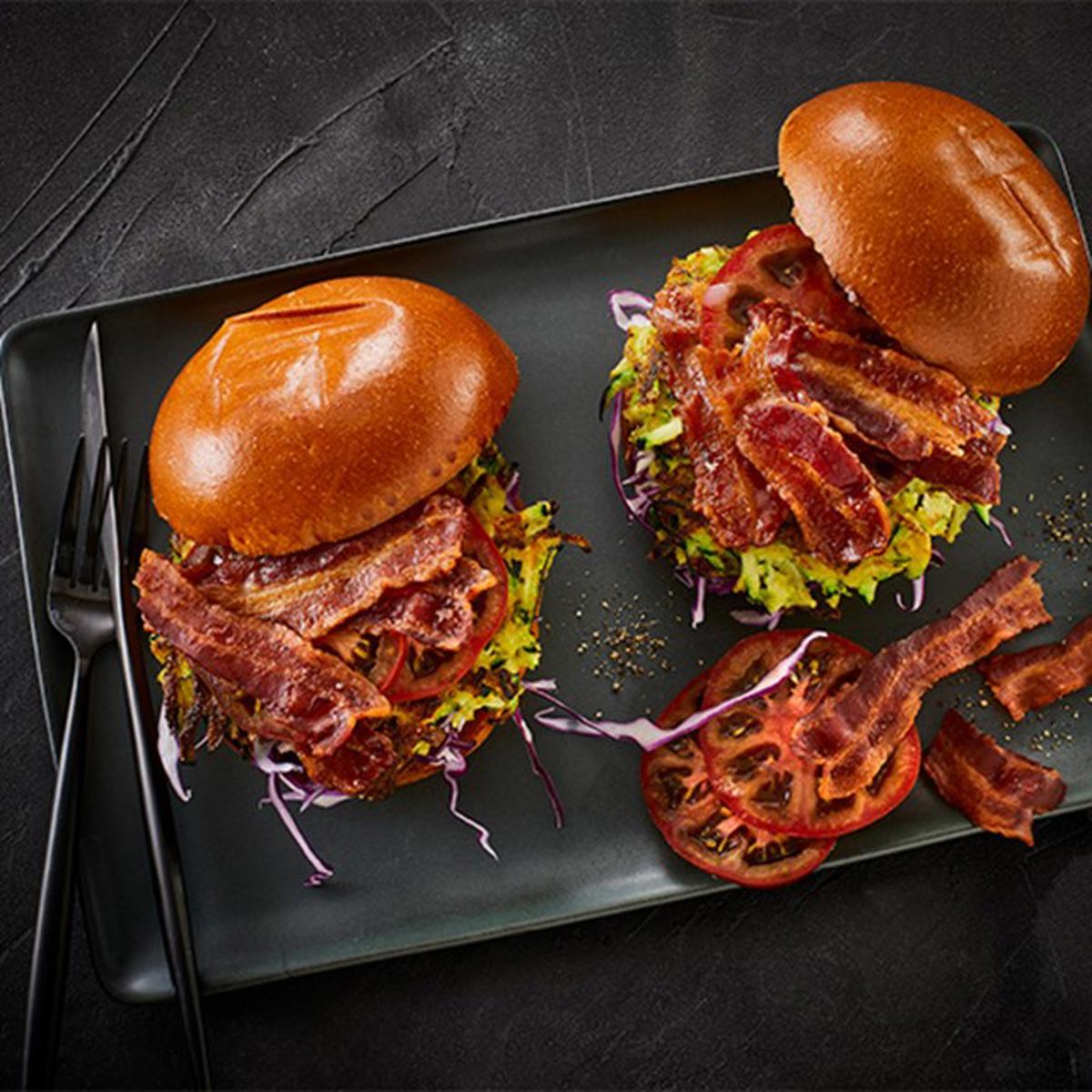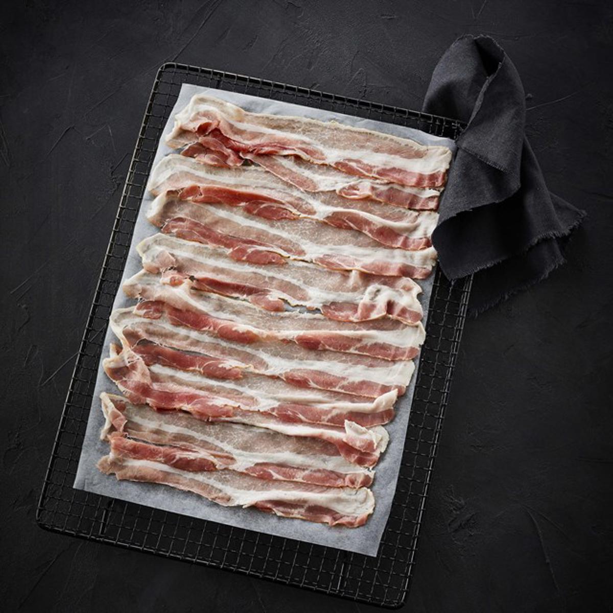 Knusprig: Bacon-Scheiben in eine heiße, trockene Pfanne legen. Bei hoher Wärme beidseitig rösten, bis sie schön braun sind.