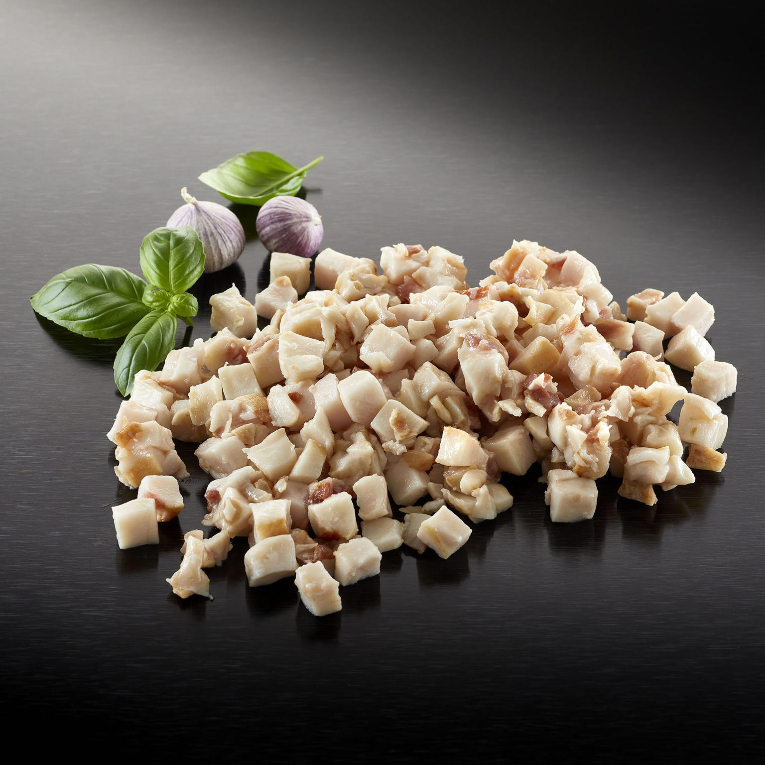 Geräucherter Rückenspeck in Würfeln, 8 x 8 mm. Der Geschmacksträger, z. B. zum Verfeinern von deftigen Eintöpfen.