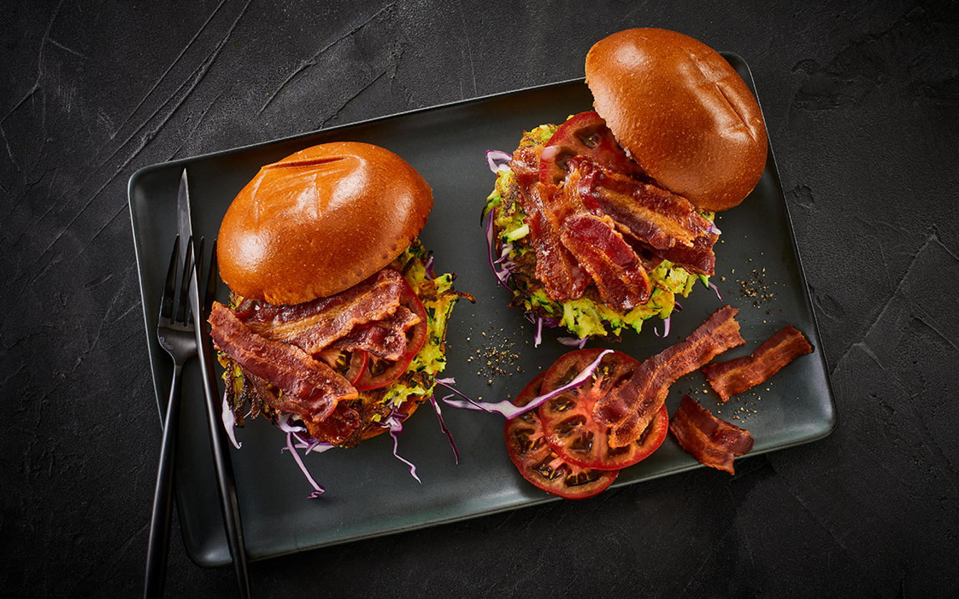 Lust auf einen vegetarisch inspirierten Burger mit knusprigem Bacon? Dieser kreative Burger kombiniert goldbraun gebratene Zucchinirösti mit frischem roten Spitzkohl, cremiger Mayonnaise und herzhaftem Tulip Bacon – alles serviert im fluffigen Brioche-Brötchen. Perfekt für ein entspanntes Abendessen oder den nächsten Grillabend!