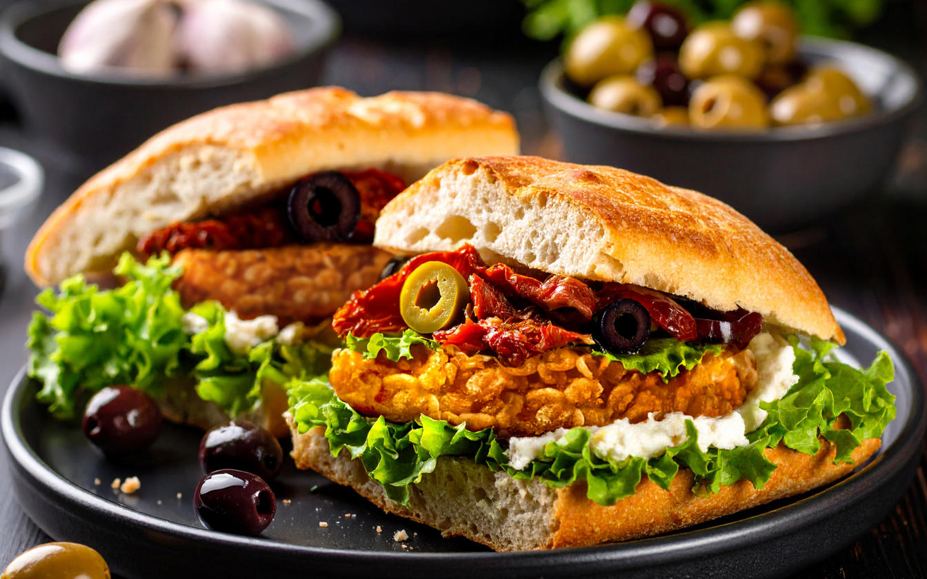 Dieser mediterrane Crispy Chicken Burger bringt Urlaubsfeeling direkt auf den Teller. Saftiges Hähnchenfilet in einer knusprigen Panade trifft auf cremigen Ricotta, getrocknete Tomaten und würzige Oliven – alles serviert im aromatischen Focaccia-Brot. Perfekt für ein schnelles, aber raffiniertes Mittag- oder Abendessen mit italienischem Flair.