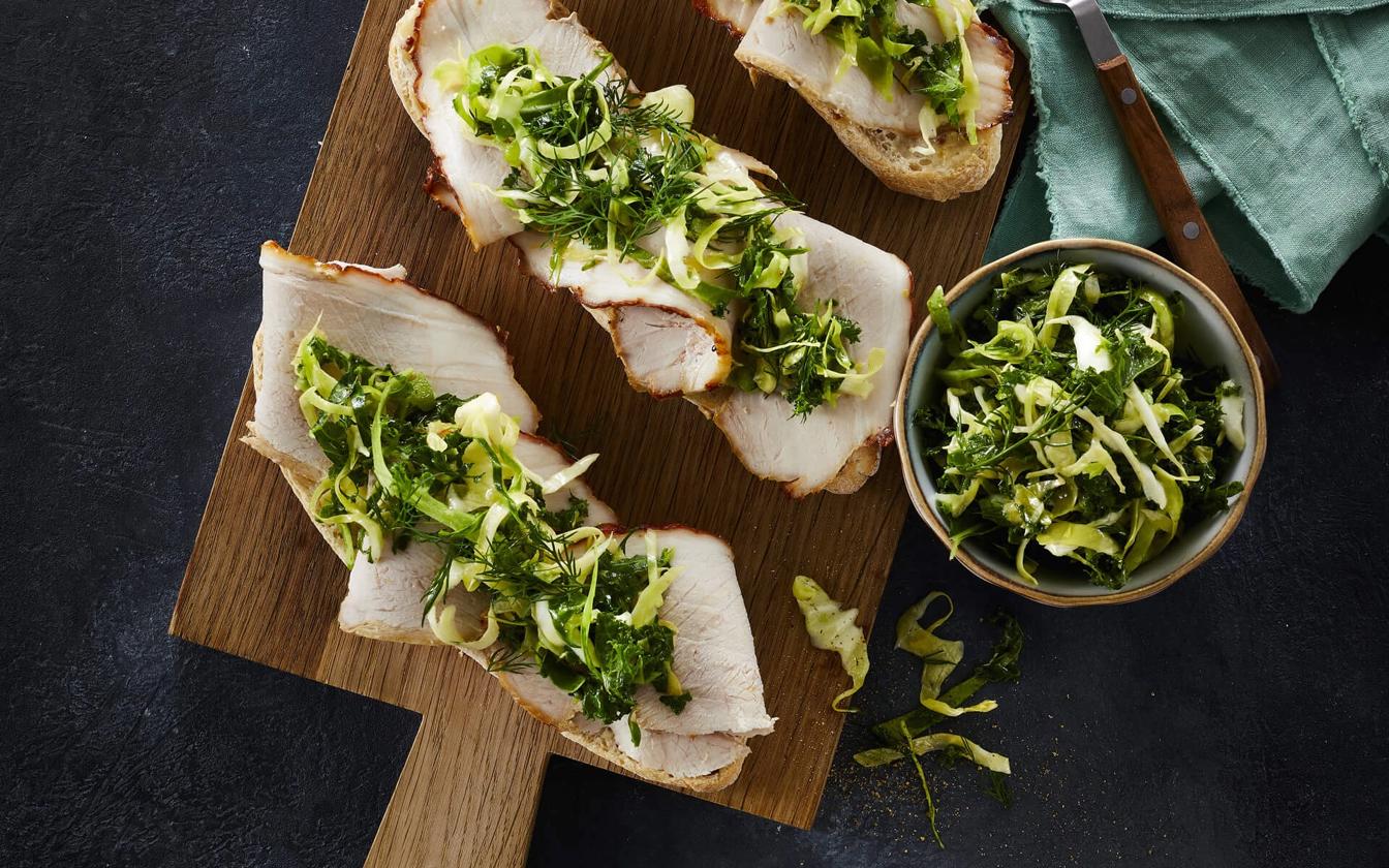 Die Brötchen halbieren und toasten. Mit der Senf-Honig-Mayonnaise bestreichen und mit dünnen Scheiben des Schinkenbratens sowie dem marinierten Krautsalat belegen.