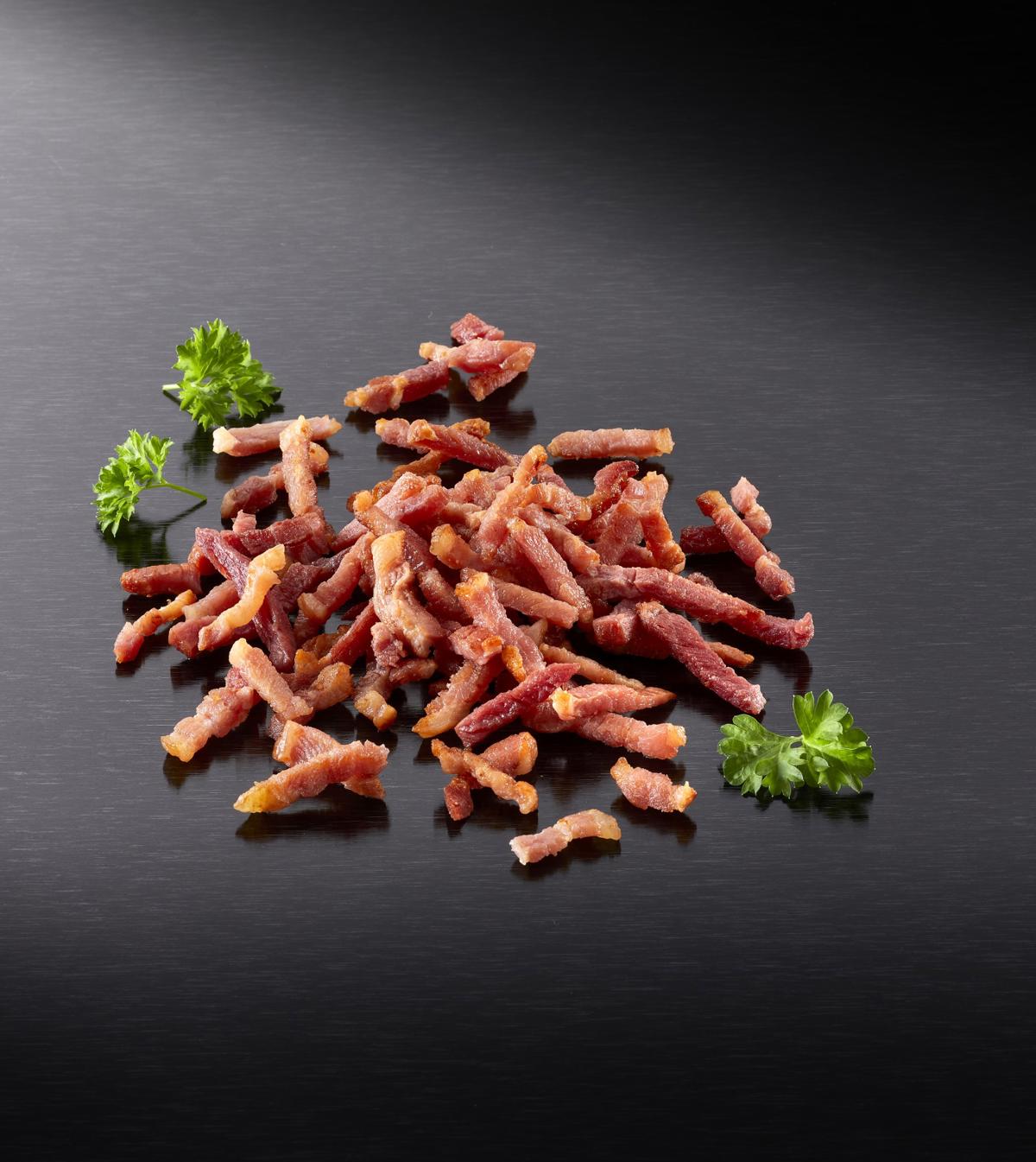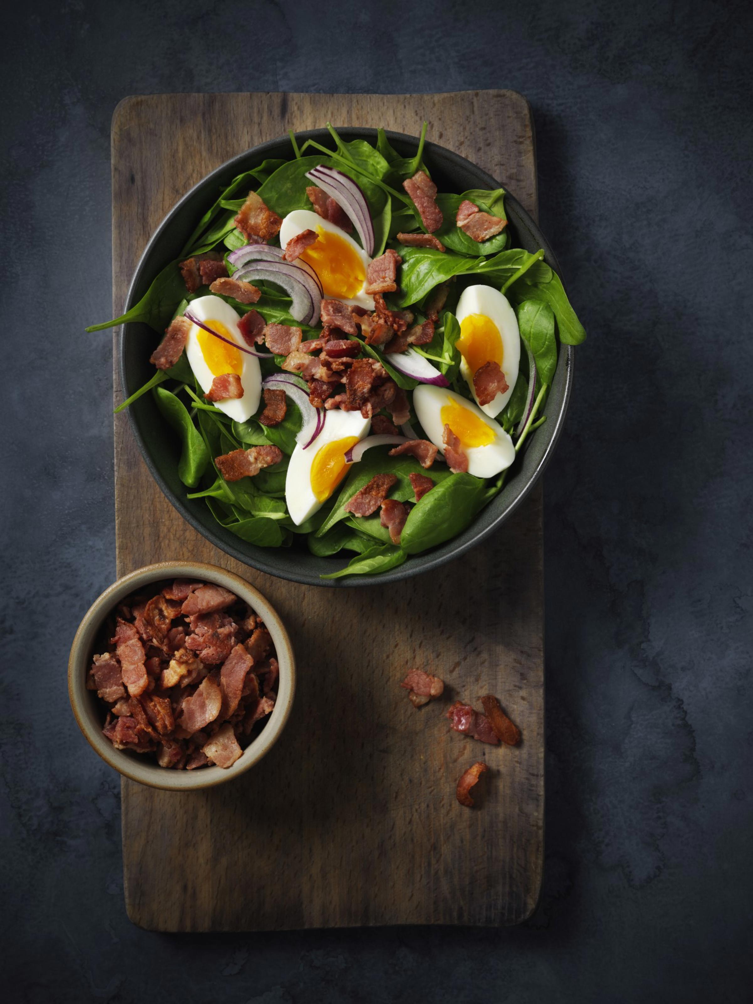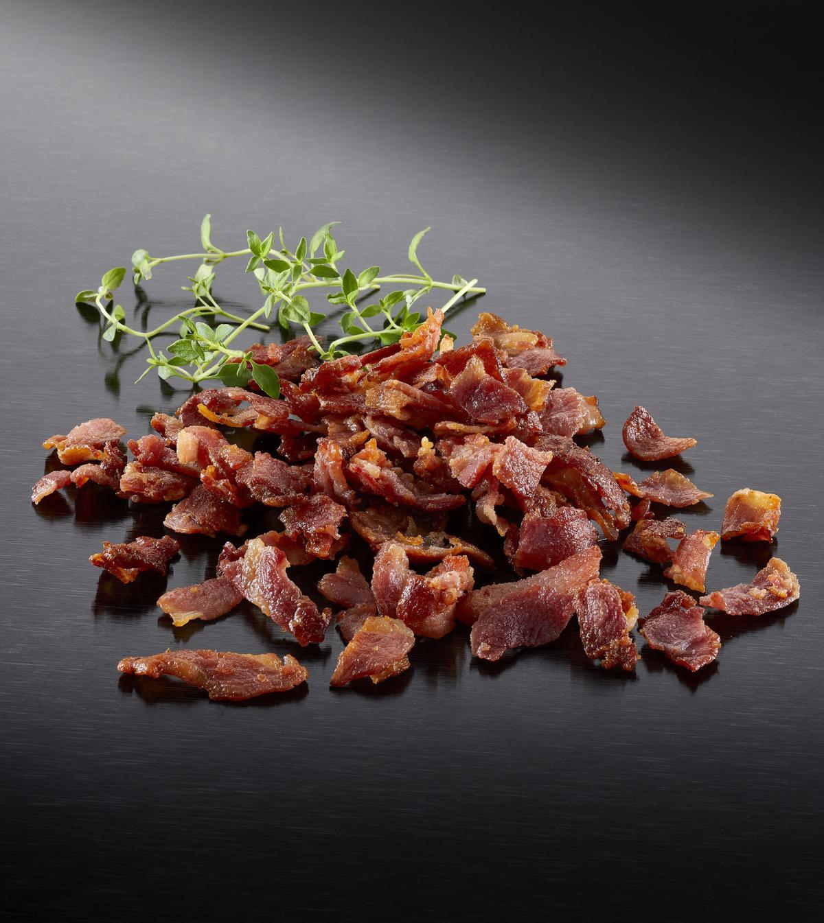 Crumbled bacon bits are commonly used as a topping for salads, adding crunch and a burst of flavor, particularly in Cobb salads or Caesar salads.