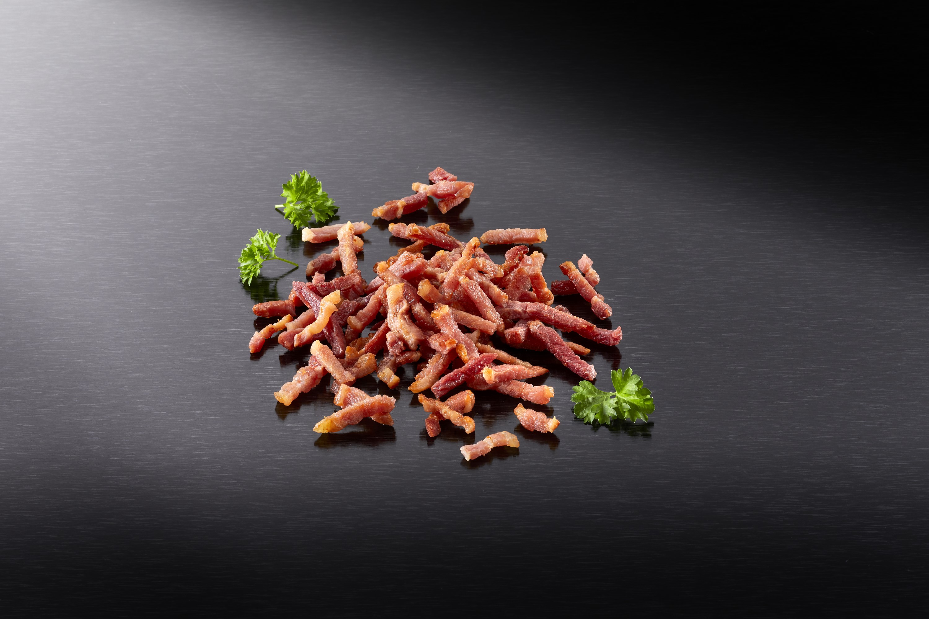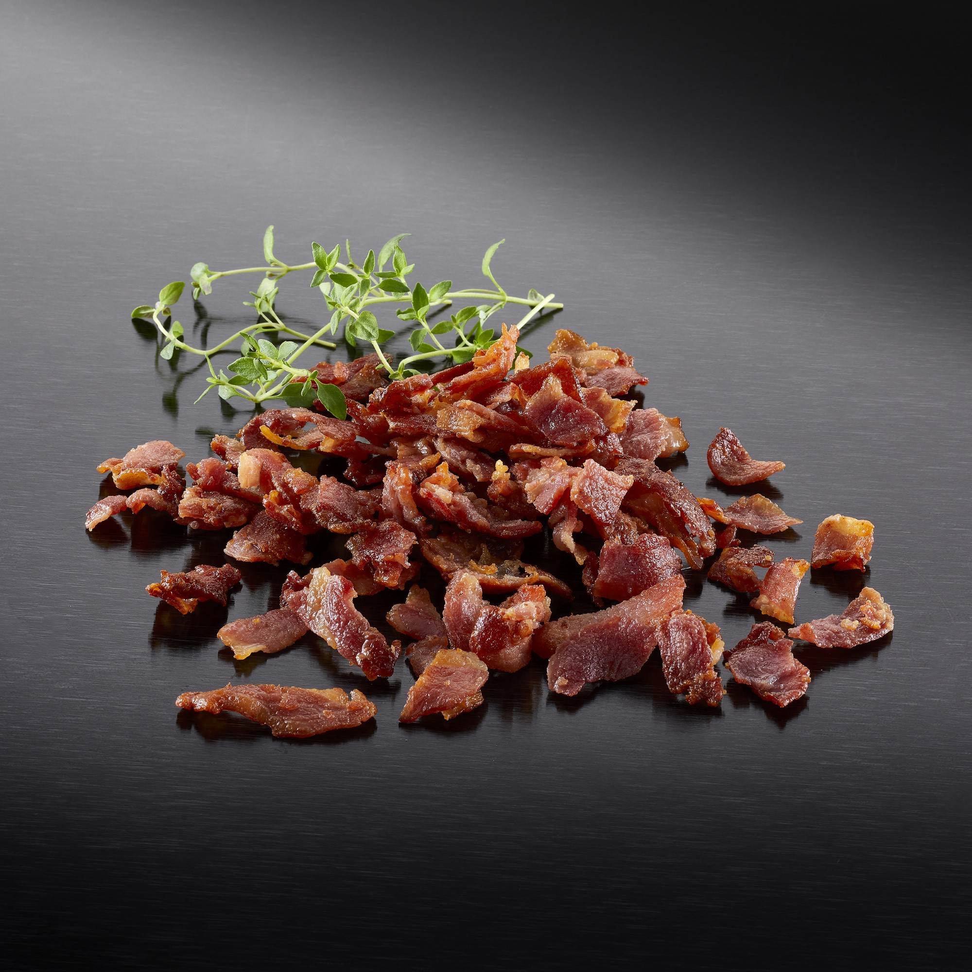 Crumbled bacon bits are commonly used as a topping for salads, adding crunch and a burst of flavor, particularly in Cobb salads or Caesar salads.