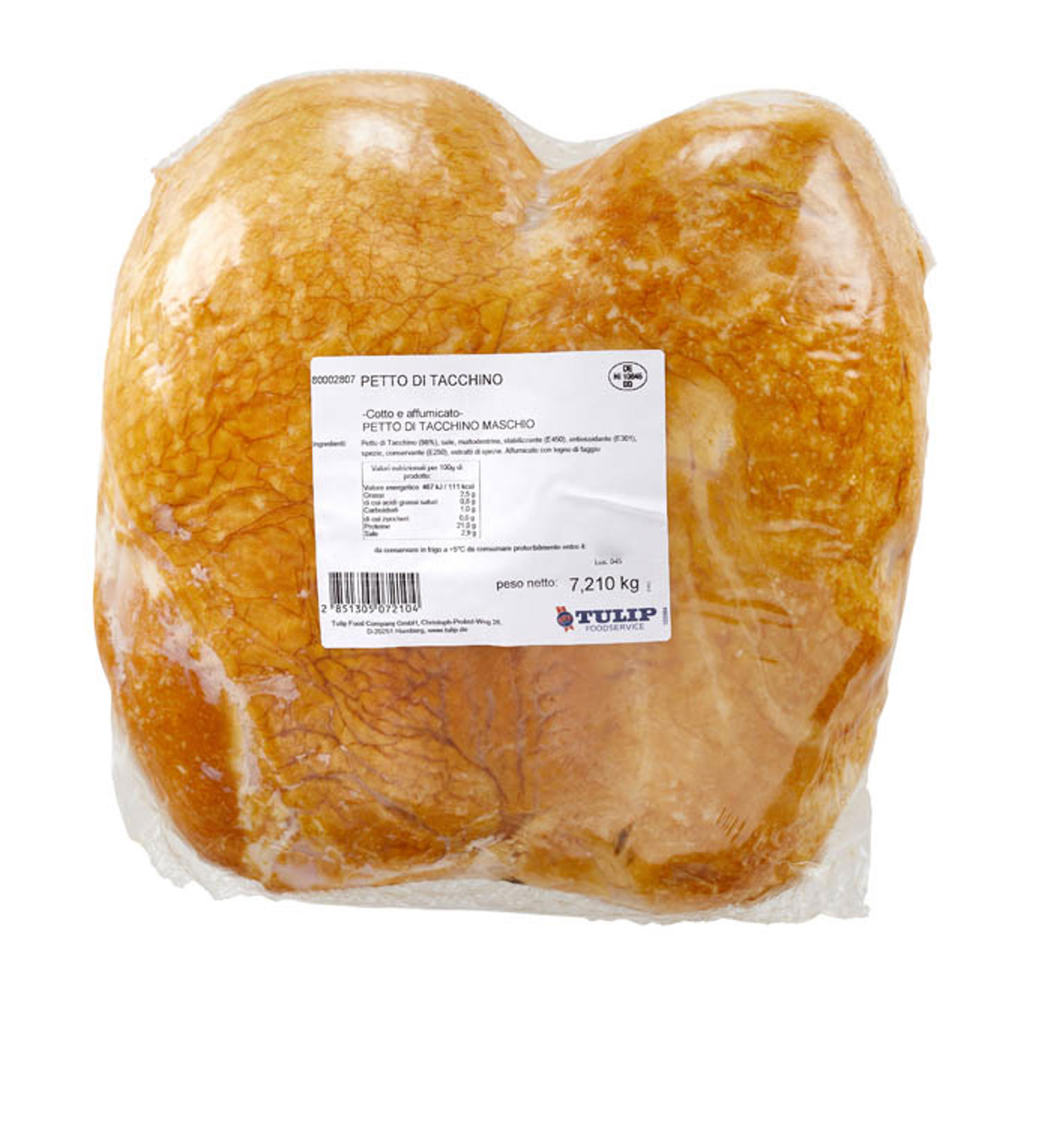 Petto di tacchino (98%), sale, maltodestrina, stabilizzante (E450), antiossidante (E301), spezie, conservante (E250), estratti di spezie. Prodotto cotto e affumicato.