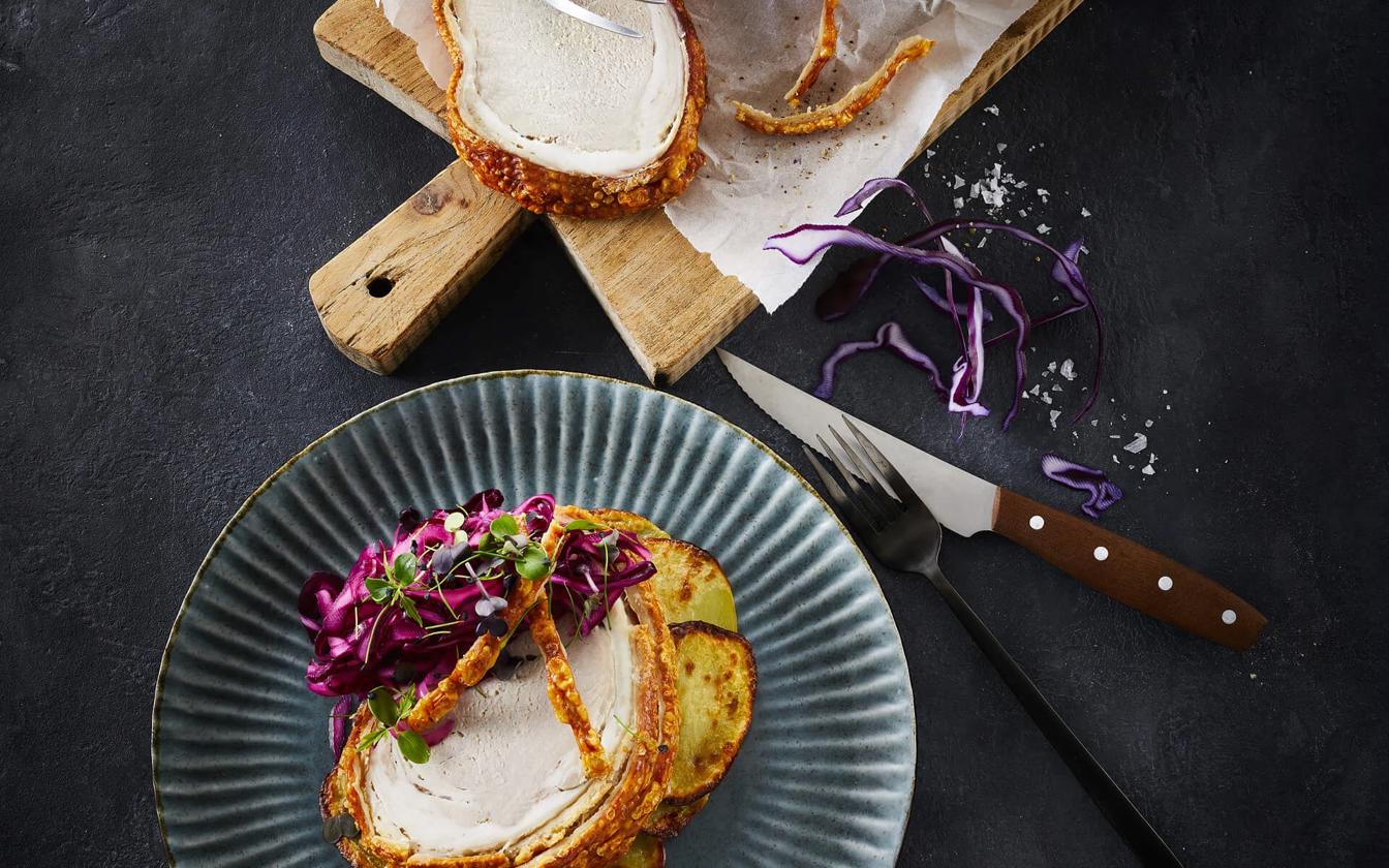 Flæskesteg med dobbeltsvær og lynsyltet kål