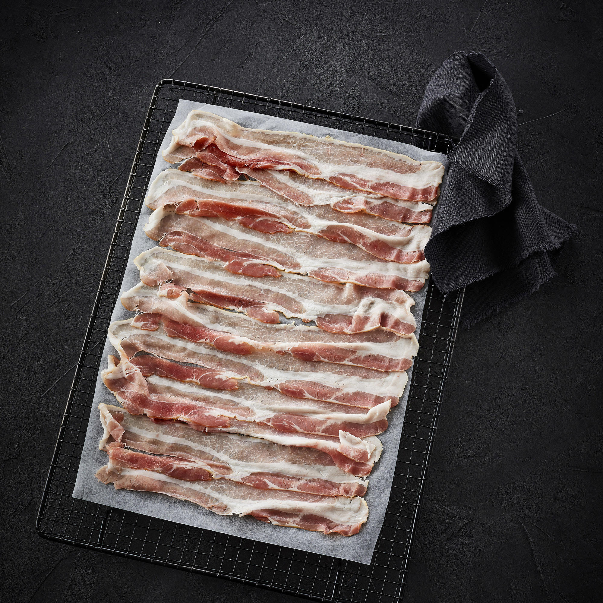 Kyld. Tulip Kalkonbacon är gjord av kalkonlår och rökt över bokved för att få sin fina baconsmak. Baconet är naturligt rikt på protein med en proteinhalt på 18 %, och innehåller samtidigt endast 6 % fett. Passar utmärkt att servera till hotellfrukost, hamburgare sallad, smörgåsar eller som topping.