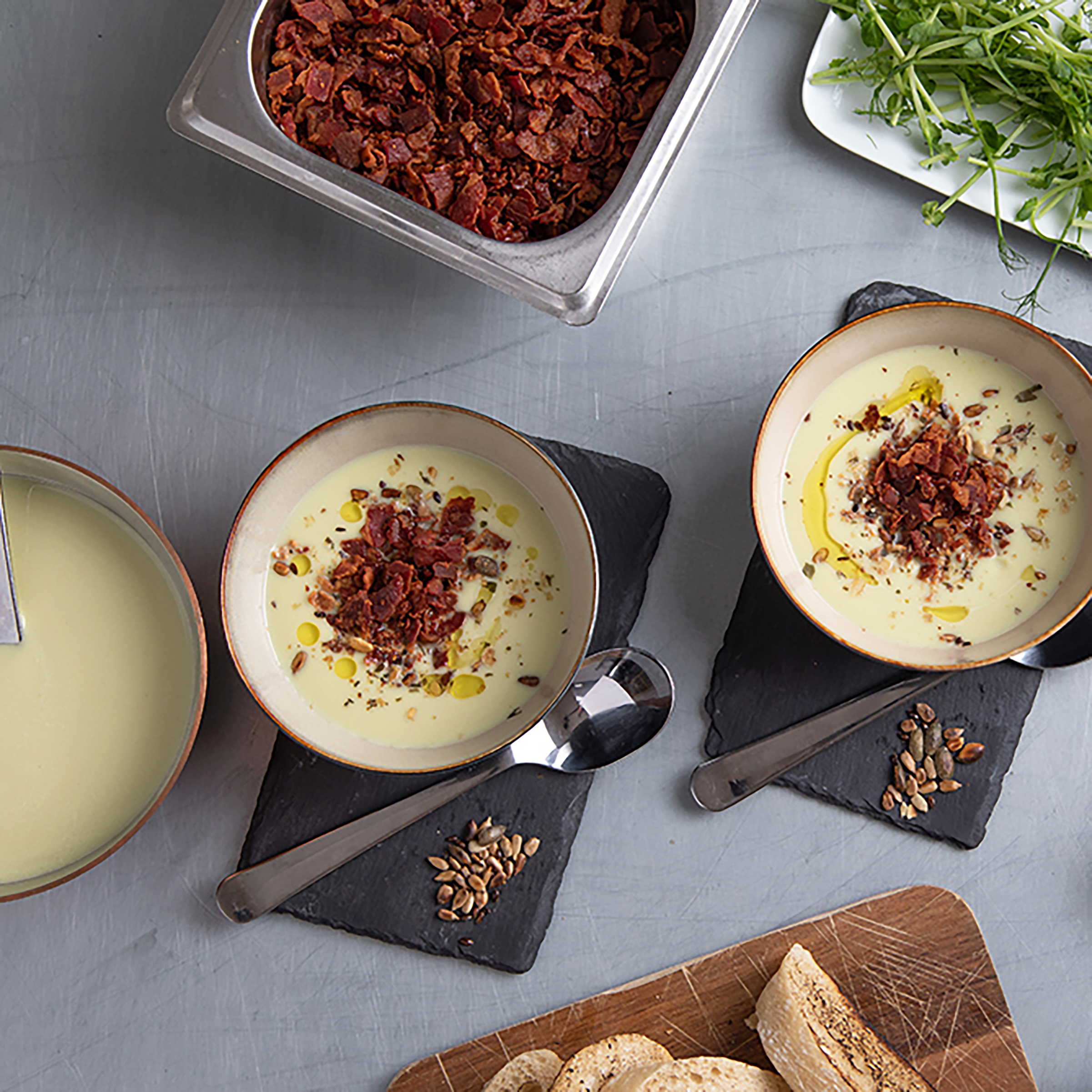Kyld. Tulip Kalkonbacon är gjord av kalkonlår och rökt över bokved för att få sin fina baconsmak. Baconet är naturligt rikt på protein med en proteinhalt på 18 %, och innehåller samtidigt endast 6 % fett. Passar utmärkt att servera till hotellfrukost, hamburgare sallad, smörgåsar eller som topping.