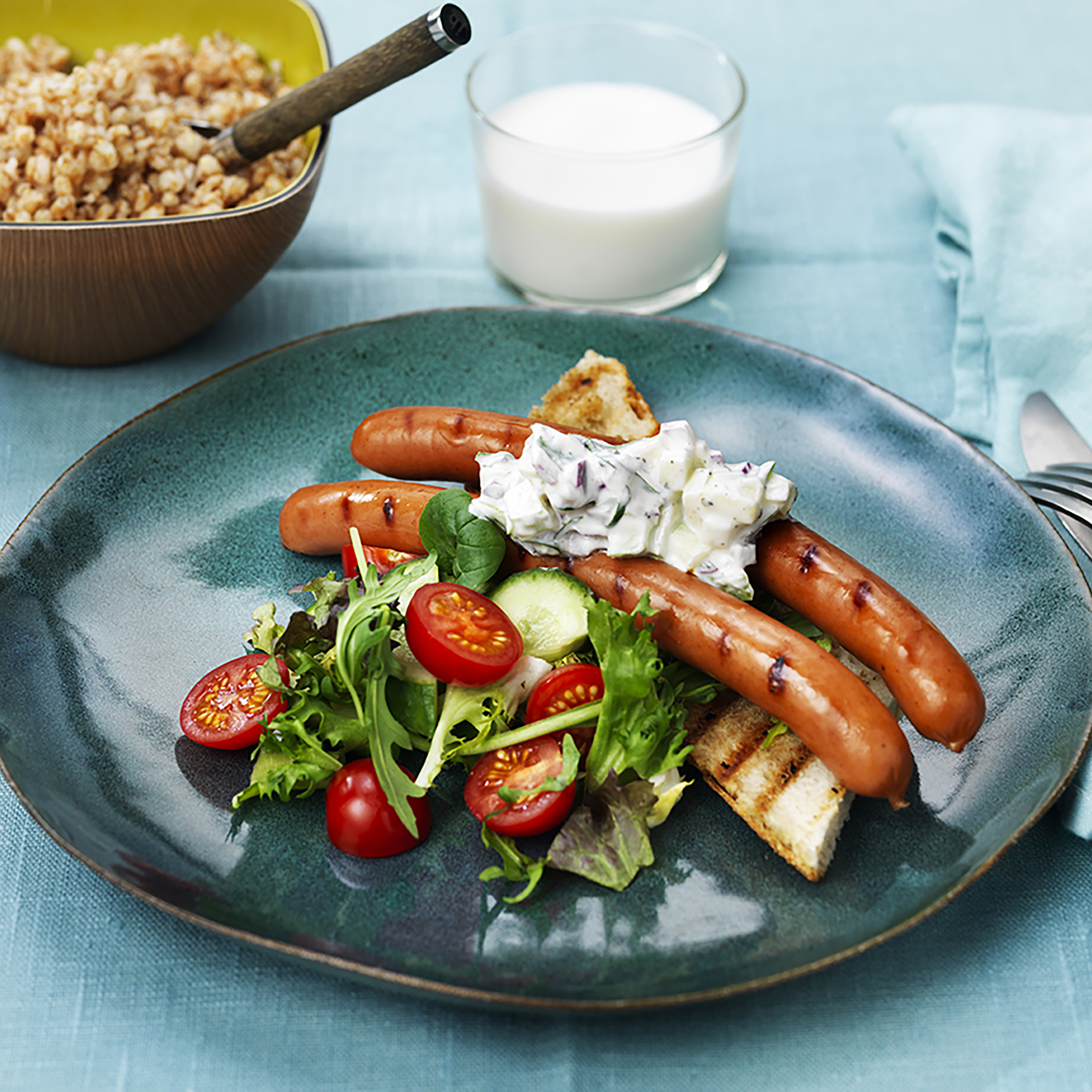 Griskött (80%), vatten, potatismjöl, salt, SOJAPROTEIN, druvsocker, stabiliseringsmedel (E 451), kryddor, kryddextrakt, lök, antioxidationsmedel (E 300, E 301, E 331), konserveringsmedel (E250), lammtarm.