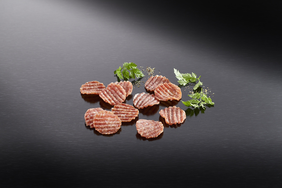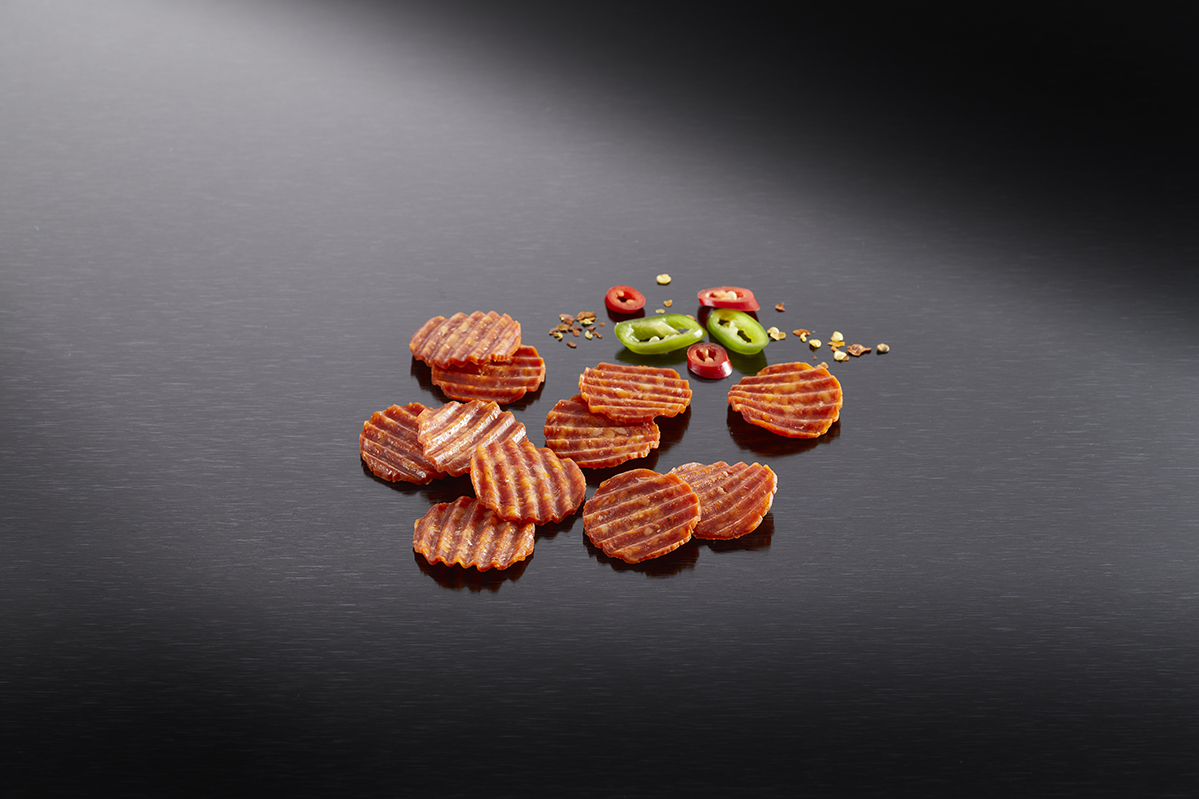 Servera tilltugg som ger en extra smakupplevelse med GØL Salami Chips Chili. De är fint skurna och räfflade salamibitar med bra sting av chili. Servera salamichips som ett perfekt barsnack, eller som tapas och till buffén.