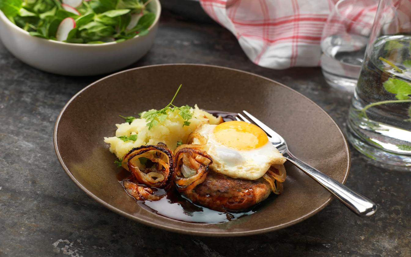 Femöring på pannbiff med stekt ägg och rödvinsky