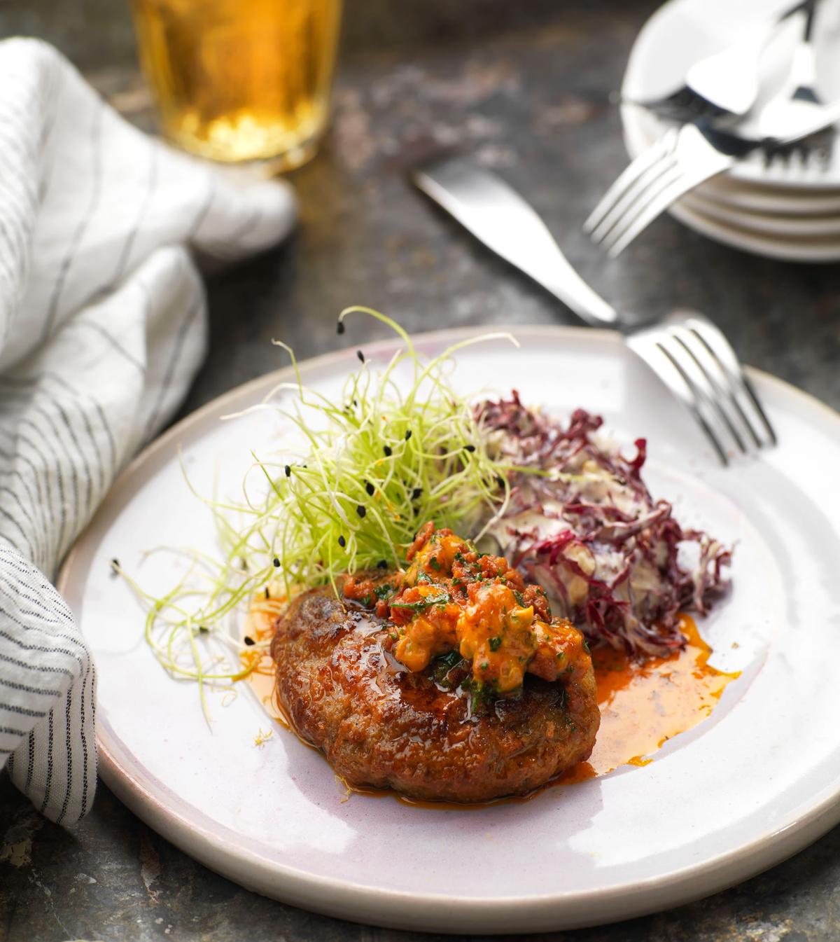 Stek eller värm biffarna i ugn. Lägg upp på tallrikar eller fat, skeda på lök och sky och avsluta med ett stekt ägg. Servera tillsammans med potatis och sallad.
