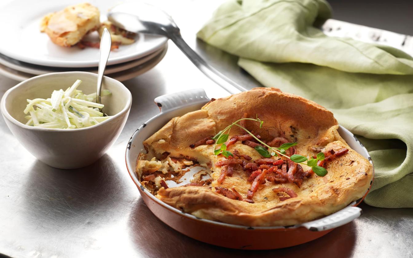 Viska en slät pannkakassmet av ägg, mjöl och mjölk. Låt smeten vila någon timme i kylen (eller över natten). Strimla fläsket och stek det knaprigt och rör ner det i smeten. Smaka av med salt och svartpeppar.