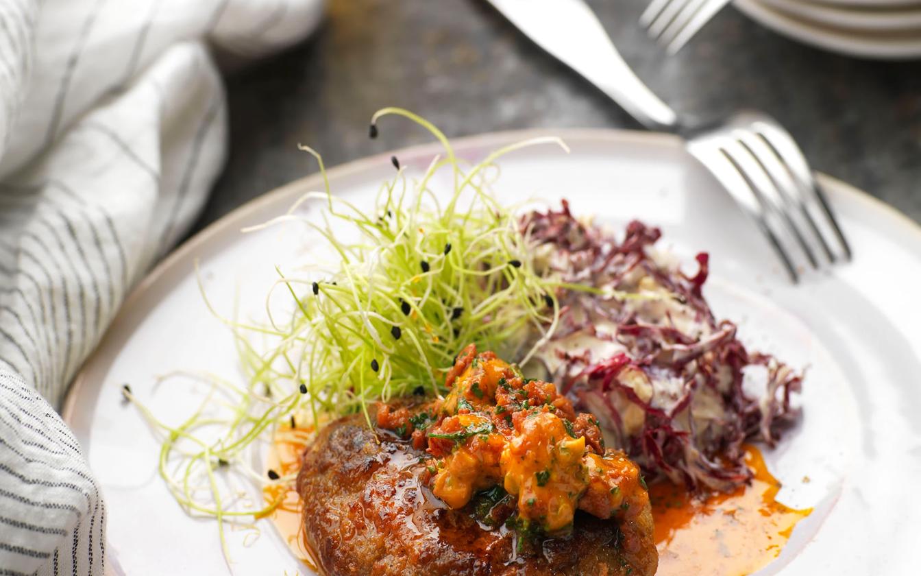 Stek eller värm biffarna i ugn. Lägg upp på tallrikar eller fat och servera tillsammans med kålsallad och en fin bit kryddsmör. Toppa med ett nystan groddar.