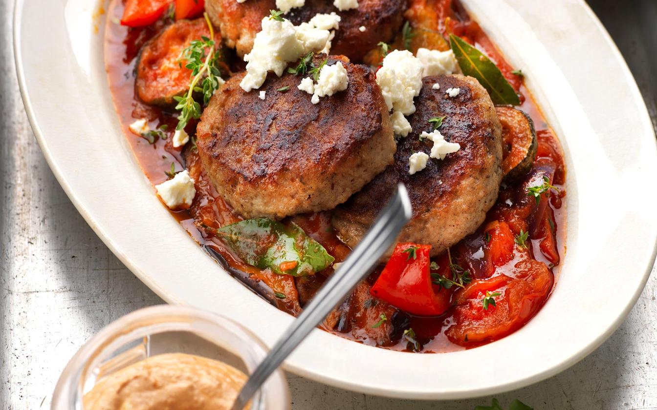 Stek eller värm biffarna i ugn. Lägg upp ratatouille på tallrikar eller fat, placera biffarna överst och servera tillsammans med fetacremé och finhackade örter.