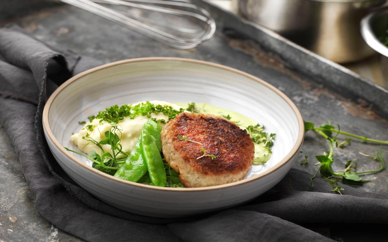 Pannbiff med vitlöksmos och kall krassesås