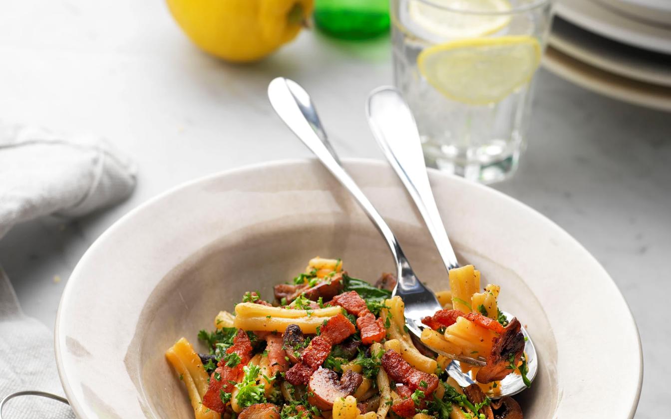 Strimla fläsket och stek det knaprigt i oljan. Låt fettet rinna av. Stek svamp, lök och vitlök på hög värme i olivoljan. Rör i fläsket och pastan, låt det bli ordentligt varmt. Vänd i spenaten och smaksätt med persilja och vinäger. Smaka av med salt och svartpeppar.